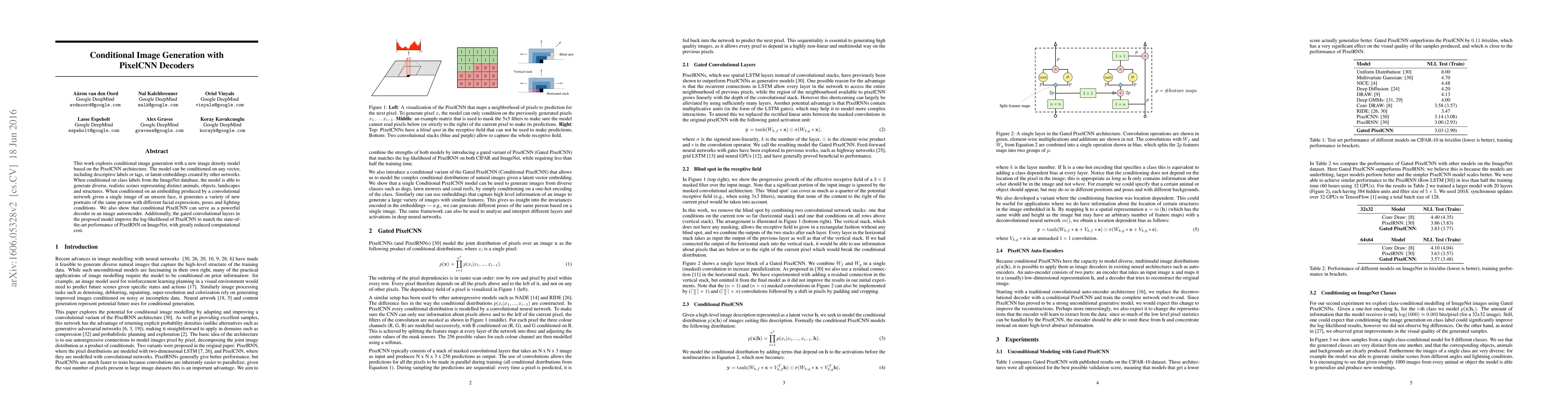 This paper introduces a conditional image generation model based on PixelCNN decoders, capable of generating diverse, realistic images when conditioned on labels or embeddings. It also demonstrates the model's effectiveness as a powerful decoder in image autoencoders, achieving state-of-the-art performance with lower computational costs.