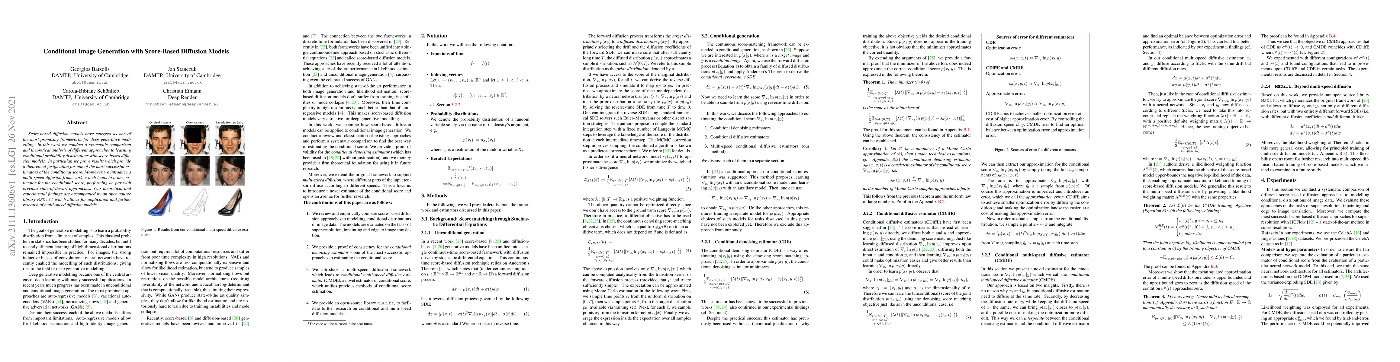 Score-based diffusion models have emerged as one of the most promising frameworks for deep generative modelling. In this work we conduct a systematic comparison and theoretical analysis of different approaches to learning conditional probability distributions with score-based diffusion models. In particular, we prove results which provide a theoretical justification for one of the most successful estimators of the conditional score. Moreover, we introduce a multi-speed diffusion framework, which leads to a new estimator for the conditional score, performing on par with previous state-of-the-art approaches. Our theoretical and experimental findings are accompanied by an open source library MSDiff which allows for application and further research of multi-speed diffusion models.