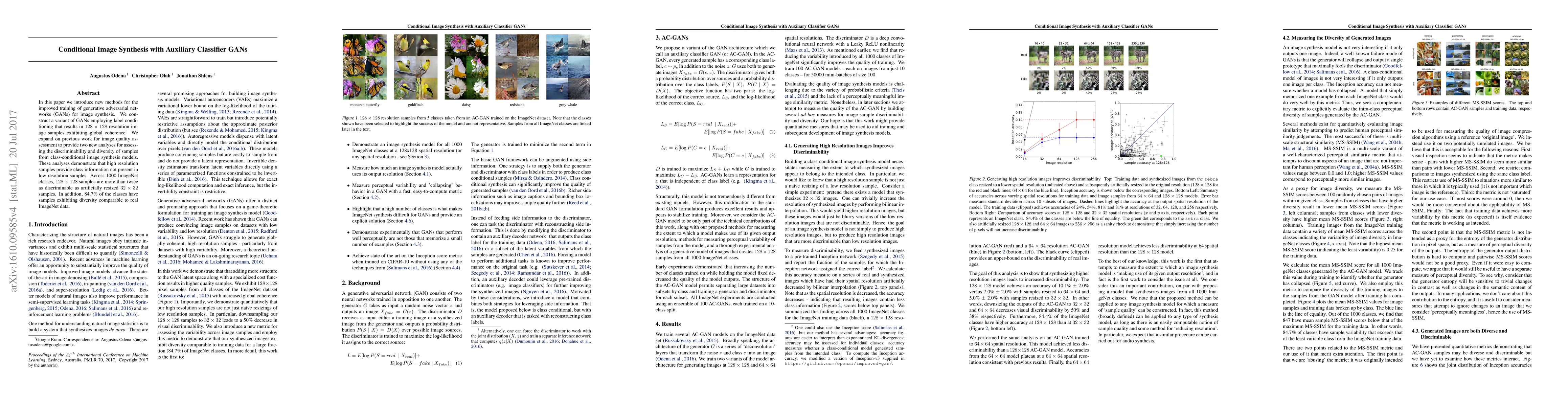 Synthesizing high resolution photorealistic images has been a long-standing challenge in machine learning. In this paper we introduce new methods for the improved training of generative adversarial networks (GANs) for image synthesis. We construct a variant of GANs employing label conditioning that results in 128x128 resolution image samples exhibiting global coherence. We expand on previous work for image quality assessment to provide two new analyses for assessing the discriminability and diversity of samples from class-conditional image synthesis models. These analyses demonstrate that high resolution samples provide class information not present in low resolution samples. Across 1000 ImageNet classes, 128x128 samples are more than twice as discriminable as artificially resized 32x32 samples. In addition, 84.7% of the classes have samples exhibiting diversity comparable to real ImageNet data.