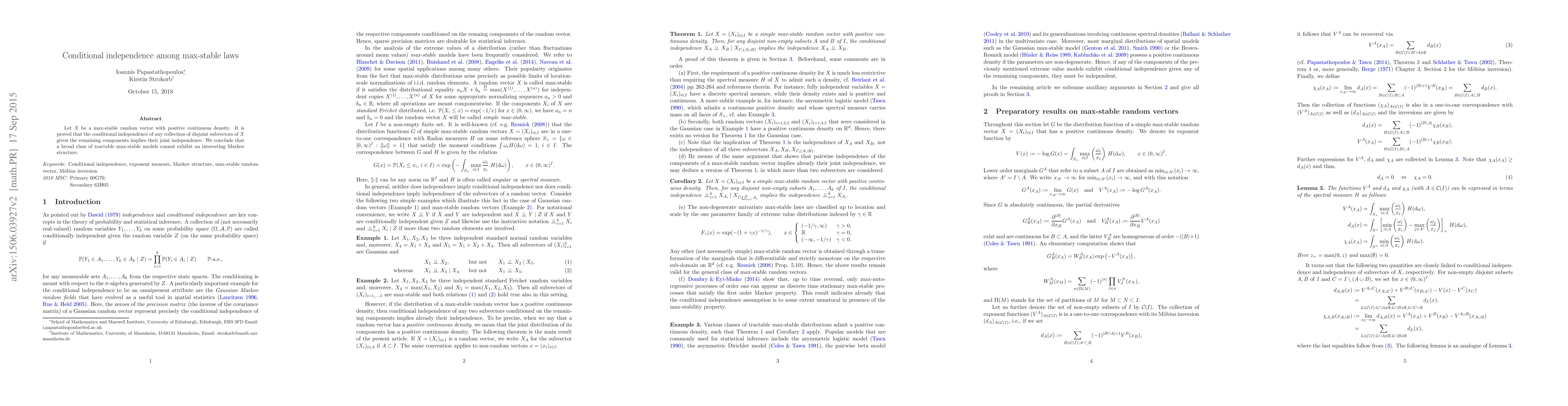 This paper proves that conditional independence among disjoint sub-vectors of a max-stable random vector, given the remaining components, implies their joint independence, concluding that many tractable max-stable models lack interesting Markov structures.