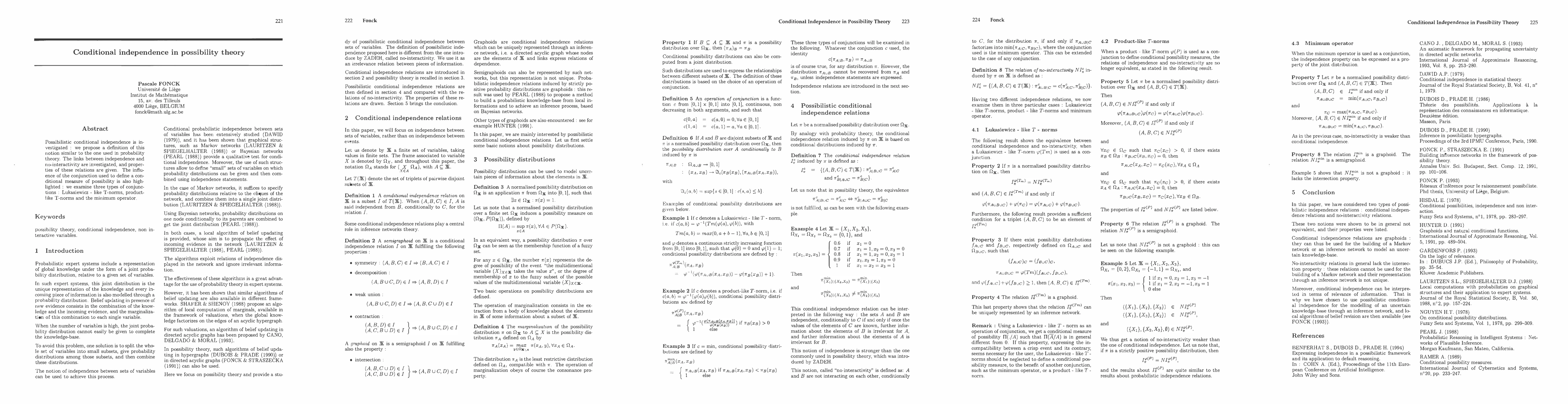 This paper defines possibilistic conditional independence akin to probability theory and explores its connections to non-interactivity. It examines the impact of different conjunctions, including Lukasiewicz, product-like T-norms, and the minimum operator, on the conditional measure of possibility.