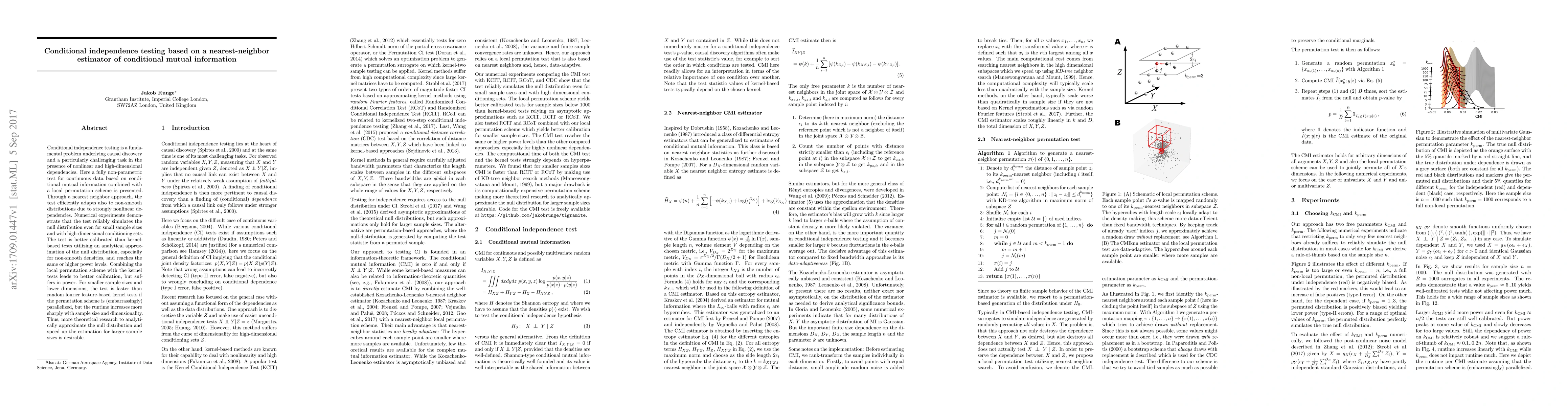 Conditional independence testing is a fundamental problem underlying causal discovery and a particularly challenging task in the presence of nonlinear and high-dimensional dependencies. Here a fully non-parametric test for continuous data based on conditional mutual information combined with a local permutation scheme is presented. Through a nearest neighbor approach, the test efficiently adapts also to non-smooth distributions due to strongly nonlinear dependencies. Numerical experiments demonstrate that the test reliably simulates the null distribution even for small sample sizes and with high-dimensional conditioning sets. The test is better calibrated than kernel-based tests utilizing an analytical approximation of the null distribution, especially for non-smooth densities, and reaches the same or higher power levels. Combining the local permutation scheme with the kernel tests leads to better calibration, but suffers in power. For smaller sample sizes and lower dimensions, the test is faster than random fourier feature-based kernel tests if the permutation scheme is (embarrassingly) parallelized, but the runtime increases more sharply with sample size and dimensionality. Thus, more theoretical research to analytically approximate the null distribution and speed up the estimation for larger sample sizes is desirable.