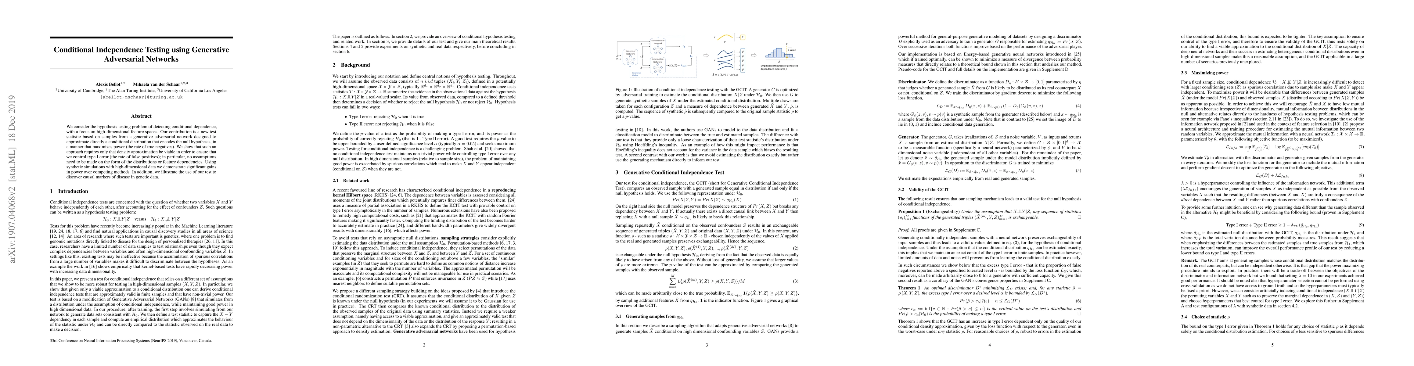 This paper proposes a novel test statistic for conditional independence using generative adversarial networks (GANs) to approximate conditional distributions. The method demonstrates significant power improvements over existing techniques in high-dimensional feature spaces and effectively controls type I error without requiring assumptions about data distribution or dependencies.