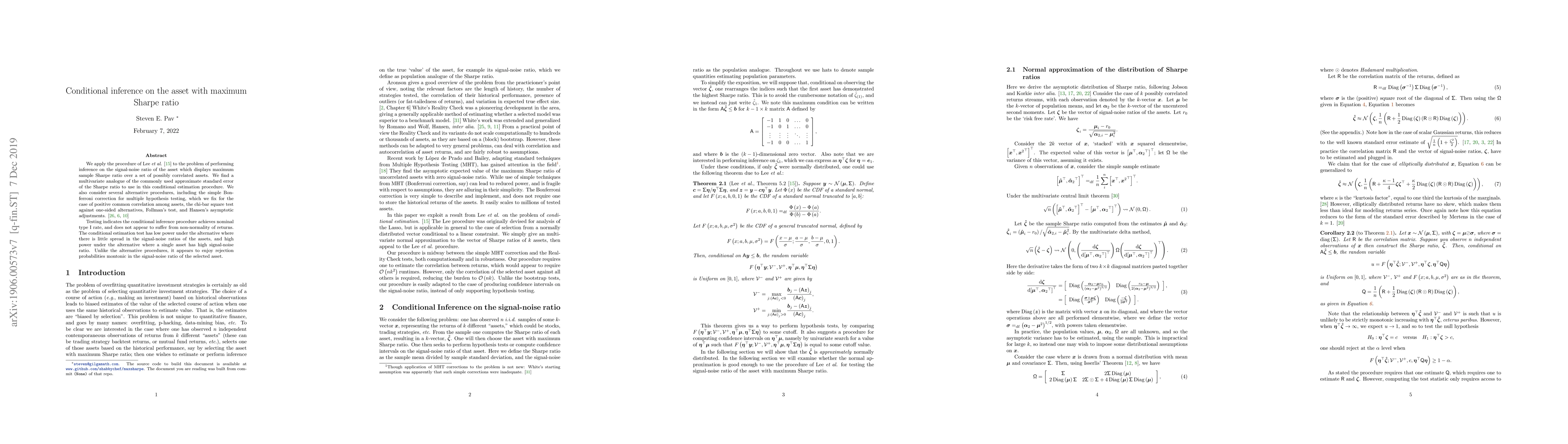 We apply the procedure of Lee et al. to the problem of performing inference on the signal-noise ratio of the asset which displays maximum sample Sharpe ratio over a set of possibly correlated assets. We find a multivariate analogue of the commonly used approximate standard error of the Sharpe ratio to use in this conditional estimation procedure. We also consider several alternative procedures, including the simple Bonferroni correction for multiple hypothesis testing, which we fix for the case of positive common correlation among assets, the chi-bar square test against one-sided alternatives, Follman's test, and Hansen's asymptotic adjustments. Testing indicates the conditional inference procedure achieves nominal type I rate, and does not appear to suffer from non-normality of returns. The conditional estimation test has low power under the alternative where there is little spread in the signal-noise ratios of the assets, and high power under the alternative where a single asset has high signal-noise ratio. Unlike the alternative procedures, it appears to enjoy rejection probabilities montonic in the signal-noise ratio of the selected asset.