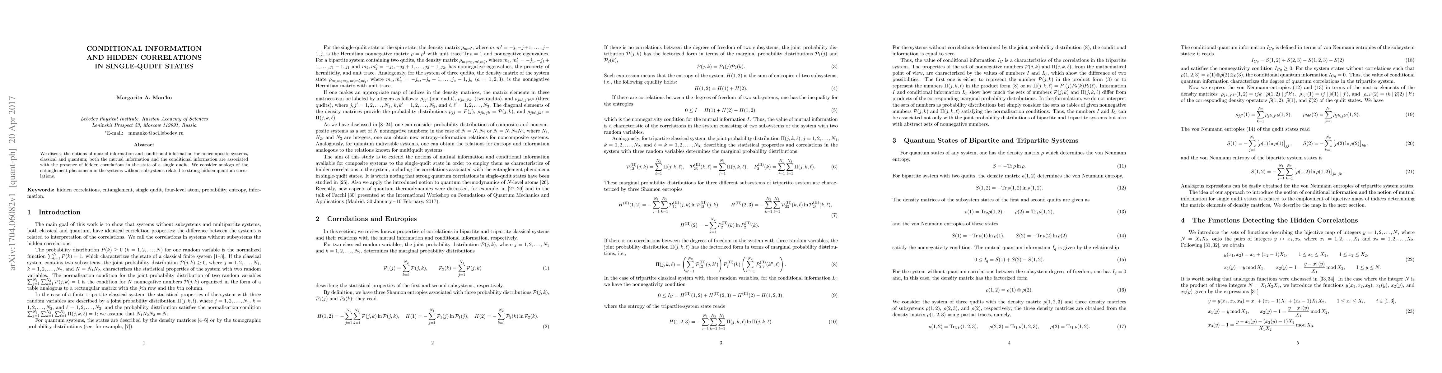 This paper explores mutual and conditional information in single-qudit states, highlighting their connection to hidden correlations and analogs of entanglement phenomena in systems without subsystems. It investigates strong hidden quantum correlations in noncomposite quantum and classical systems.