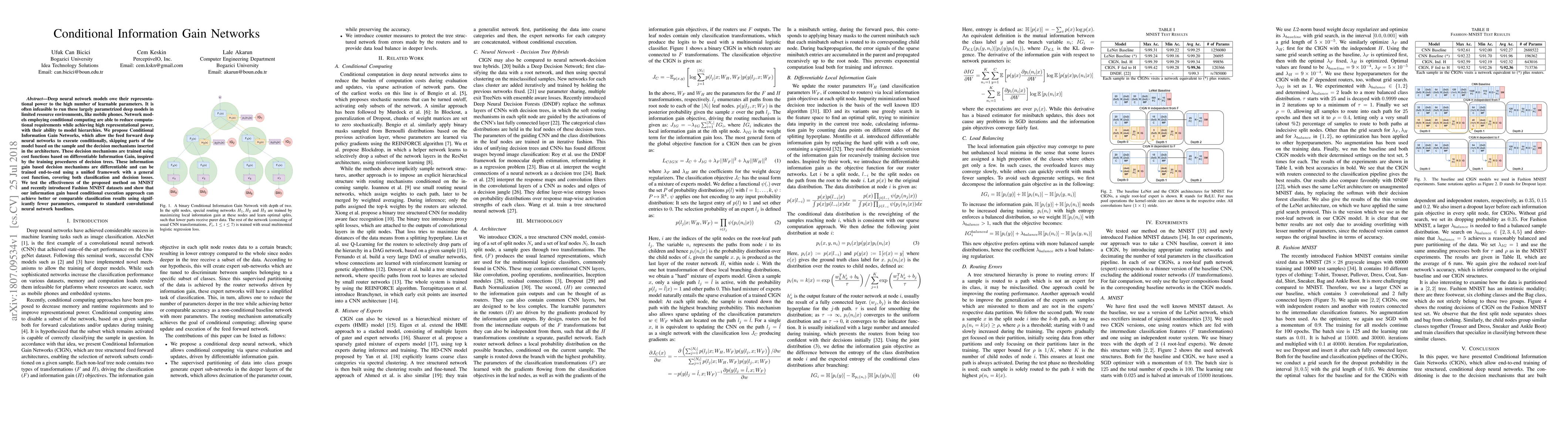 Conditional Information Gain Networks reduce computational requirements in deep neural networks by executing parts of the model conditionally based on sample and decision mechanisms trained using differentiable Information Gain. This approach achieves better or comparable classification results with significantly fewer parameters than standard convolutional neural networks.