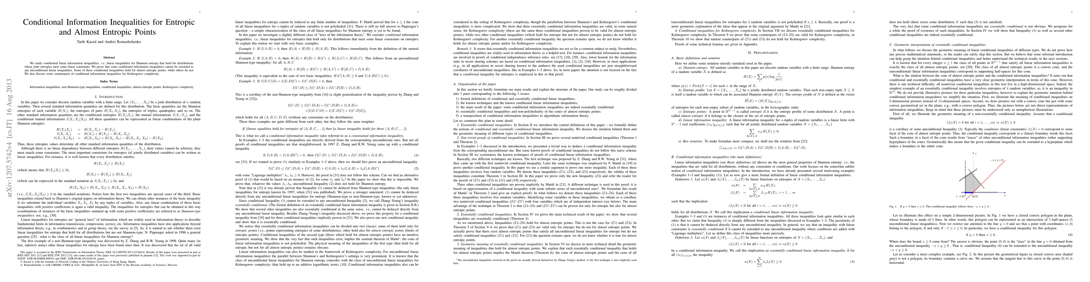 We study conditional linear information inequalities, i.e., linear inequalities for Shannon entropy that hold for distributions whose entropies meet some linear constraints. We prove that some conditional information inequalities cannot be extended to any unconditional linear inequalities. Some of these conditional inequalities hold for almost entropic points, while others do not. We also discuss some counterparts of conditional information inequalities for Kolmogorov complexity.