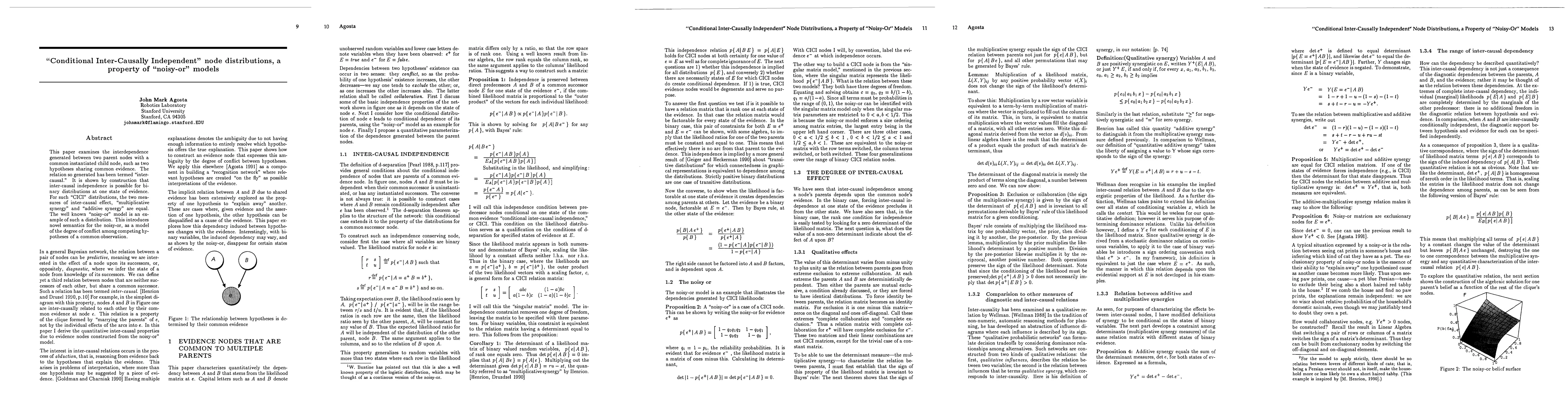This paper examines the interdependence generated between two parent nodes with a common instantiated child node, such as two hypotheses sharing common evidence. The relation so generated has been termed "intercausal." It is shown by construction that inter-causal independence is possible for binary distributions at one state of evidence. For such "CICI" distributions, the two measures of inter-causal effect, "multiplicative synergy" and "additive synergy" are equal. The well known "noisy-or" model is an example of such a distribution. This introduces novel semantics for the noisy-or, as a model of the degree of conflict among competing hypotheses of a common observation.