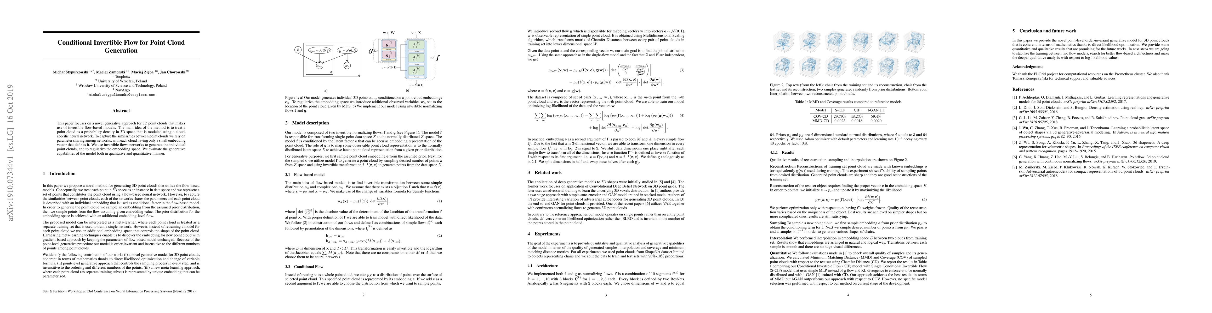 This paper introduces a novel method for generating 3D point clouds using invertible flow-based models, which capture similarities between clouds through shared embedding vectors.