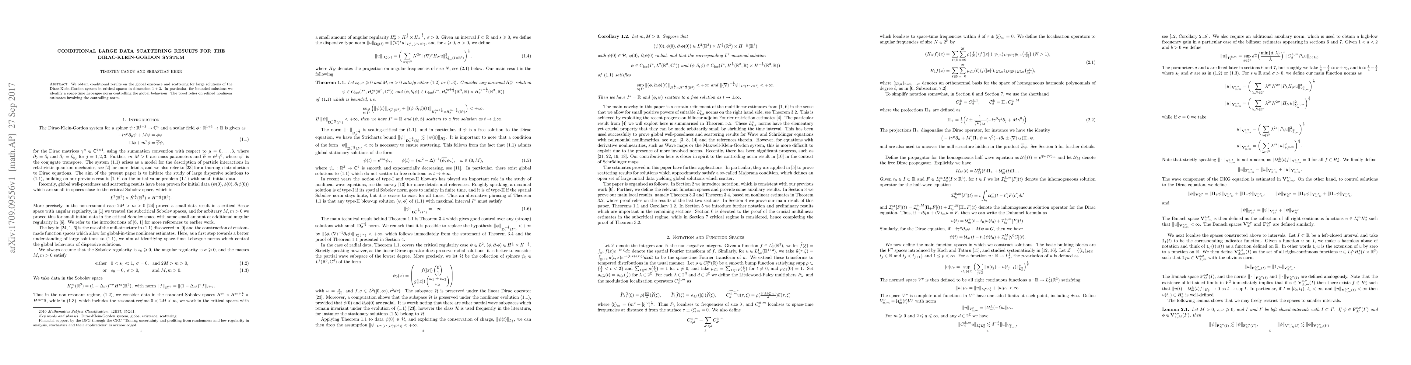 We obtain conditional results on the global existence and scattering for large solutions of the Dirac-Klein-Gordon system in critical spaces in dimension $1+3$. In particular, for bounded solutions we identify a space-time Lebesgue norm controlling the global behaviour. The proof relies on refined nonlinear estimates involving the controlling norm.