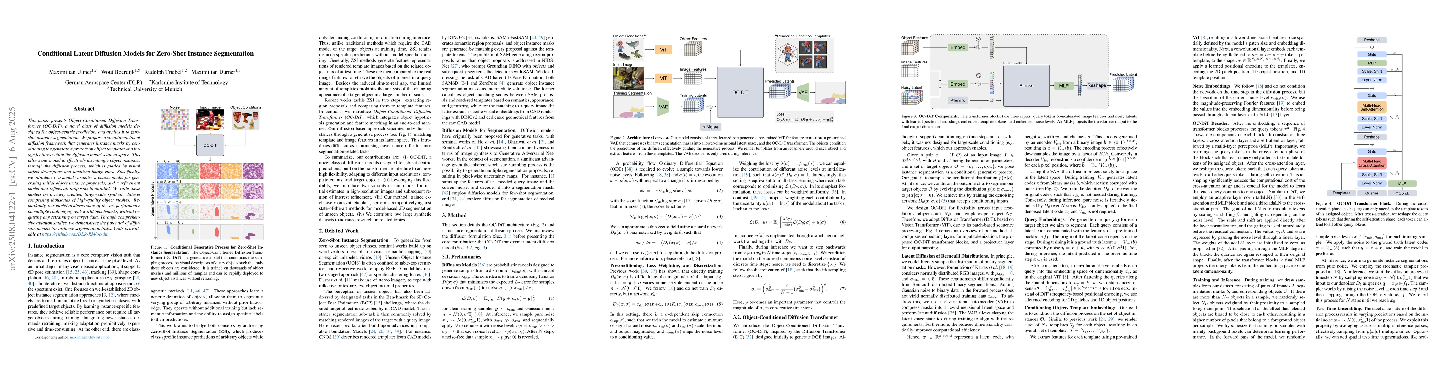 This paper presents OC-DiT, a novel class of diffusion models designed for object-centric prediction, and applies it to zero-shot instance segmentation. We propose a conditional latent diffusion framework that generates instance masks by conditioning the generative process on object templates and image features within the diffusion model's latent space. This allows our model to effectively disentangle object instances through the diffusion process, which is guided by visual object descriptors and localized image cues. Specifically, we introduce two model variants: a coarse model for generating initial object instance proposals, and a refinement model that refines all proposals in parallel. We train these models on a newly created, large-scale synthetic dataset comprising thousands of high-quality object meshes. Remarkably, our model achieves state-of-the-art performance on multiple challenging real-world benchmarks, without requiring any retraining on target data. Through comprehensive ablation studies, we demonstrate the potential of diffusion models for instance segmentation tasks.