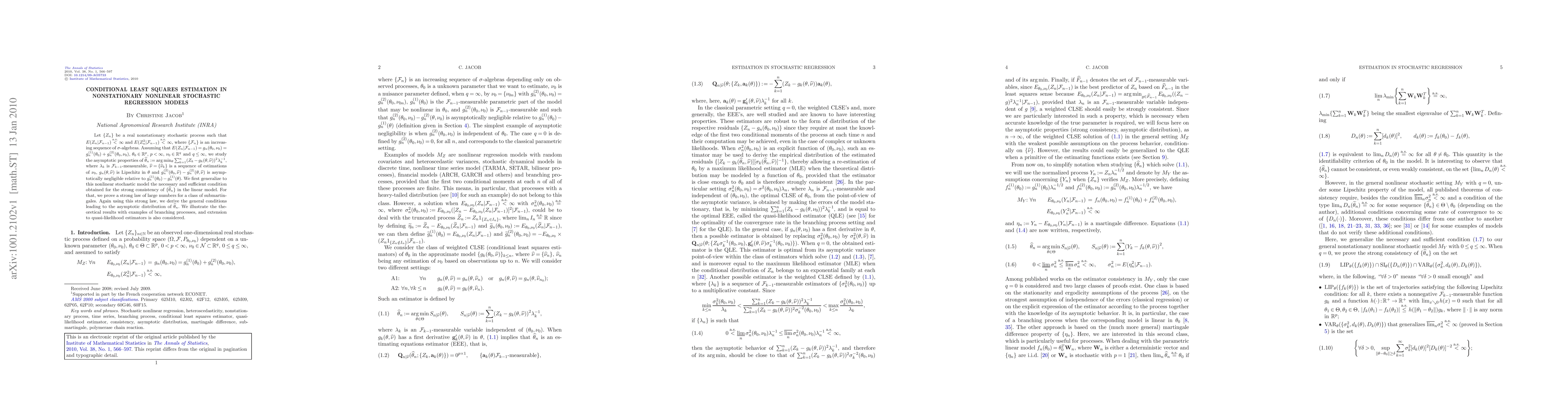 Let $\{Z_n\}$ be a real nonstationary stochastic process such that $E(Z_n|{\mathcaligr F}_{n-1})\stackrel{\mathrm{a.s.}}{<}\infty$ and $E(Z^2_n|{\mathcaligr F}_{n-1})\stackrel{\mathrm{a.s.}}{<}\infty$, where $\{{\mathcaligr F}_n\}$ is an increasing sequence of $\sigma$-algebras. Assuming that $E(Z_n|{\mathcaligr F}_{n-1})=g_n(\theta_0,\nu_0)=g^{(1)}_n(\theta_0)+g^{(2)}_n(\theta_0,\nu_0)$, $\theta_0\in{\mathbb{R}}^p$, $p<\infty$, $\nu_0\in{\mathbb{R}}^q$ and $q\leq\infty$, we study the asymptotic properties of $\hat{\theta}_n:=\arg\min_{\theta}\sum_{k=1}^n(Z_k-g_k({\theta,\hat{\nu}}))^2\lambda_k^{-1}$, where $\lambda_k$ is ${\mathcaligr F}_{k-1}$-measurable, $\hat{\nu}=\{\hat{\nu}_k\}$ is a sequence of estimations of $\nu_0$, $g_n(\theta,\hat{\nu})$ is Lipschitz in $\theta$ and $g^{(2)}_n(\theta_0,\hat{\nu})-g^{(2)}_n(\theta,\hat{\nu})$ is asymptotically negligible relative to $g^{(1)}_n(\theta_0)-g^{(1)}_n(\theta)$. We first generalize to this nonlinear stochastic model the necessary and sufficient condition obtained for the strong consistency of $\{\hat{\theta}_n\}$ in the linear model. For that, we prove a strong law of large numbers for a class of submartingales. Again using this strong law, we derive the general conditions leading to the asymptotic distribution of $\hat{\theta}_n$. We illustrate the theoretical results with examples of branching processes, and extension to quasi-likelihood estimators is also considered.