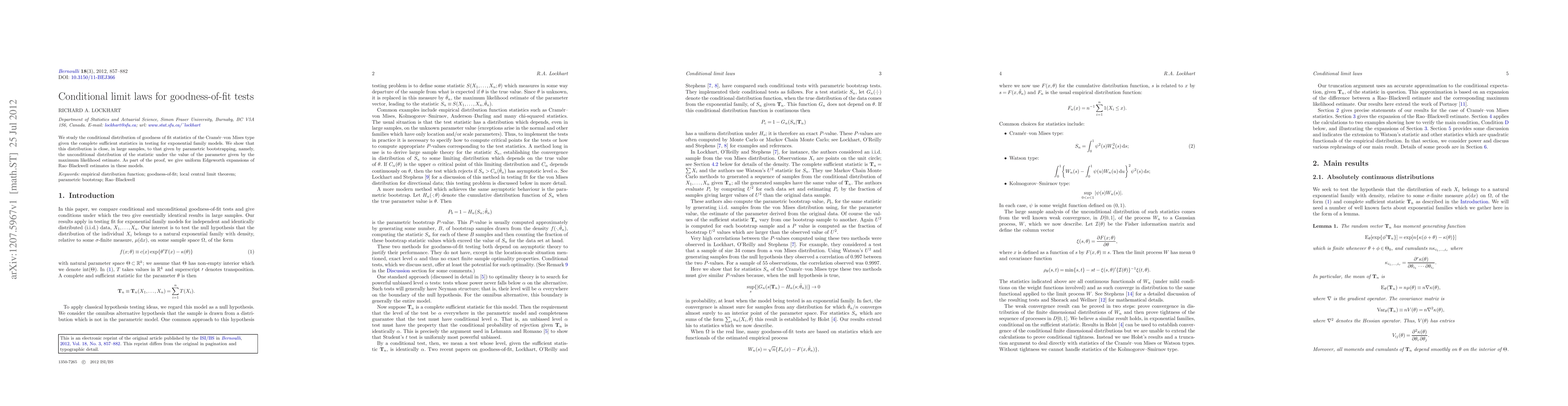 We study the conditional distribution of goodness of fit statistics of the Cram\'{e}r--von Mises type given the complete sufficient statistics in testing for exponential family models. We show that this distribution is close, in large samples, to that given by parametric bootstrapping, namely, the unconditional distribution of the statistic under the value of the parameter given by the maximum likelihood estimate. As part of the proof, we give uniform Edgeworth expansions of Rao--Blackwell estimates in these models.