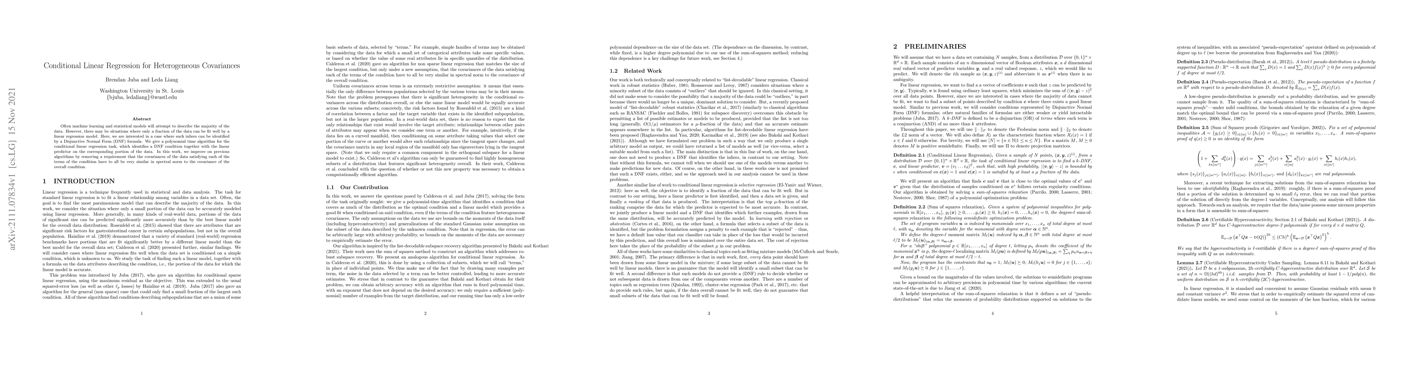 This paper proposes a polynomial time algorithm for conditional linear regression, identifying a DNF condition and corresponding linear predictor for data subsets. It improves upon previous methods by relaxing the requirement for similar covariances among subsets, allowing for more heterogeneous covariances.