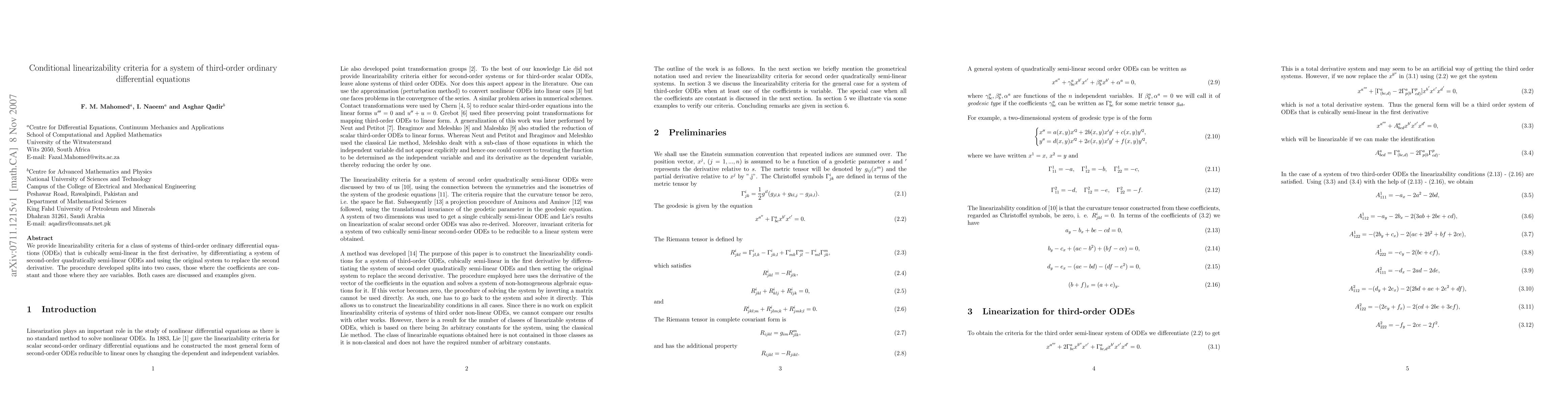 We provide linearizability criteria for a class of systems of third-order ordinary differential equations (ODEs) that is cubically semi-linear in the first derivative, by differentiating a system of second-order quadratically semi-linear ODEs and using the original system to replace the second derivative. The procedure developed splits into two cases, those where the coefficients are constant and those where they are variables. Both cases are discussed and examples given.