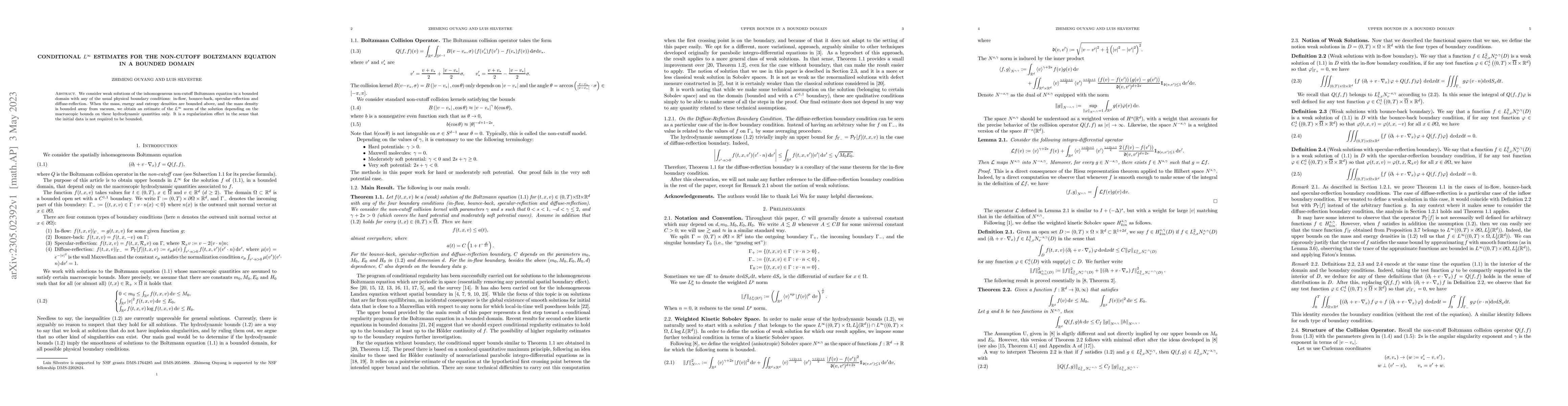 We consider weak solutions of the inhomogeneous non-cutoff Boltzmann equation in a bounded domain with any of the usual physical boundary conditions: in-flow, bounce-back, specular-reflection and diffuse-reflection. When the mass, energy and entropy densities are bounded above, and the mass density is bounded away from vacuum, we obtain an estimate of the $L^\infty$ norm of the solution depending on the macroscopic bounds on these hydrodynamic quantities only. It is a regularization effect in the sense that the initial data is not required to be bounded.