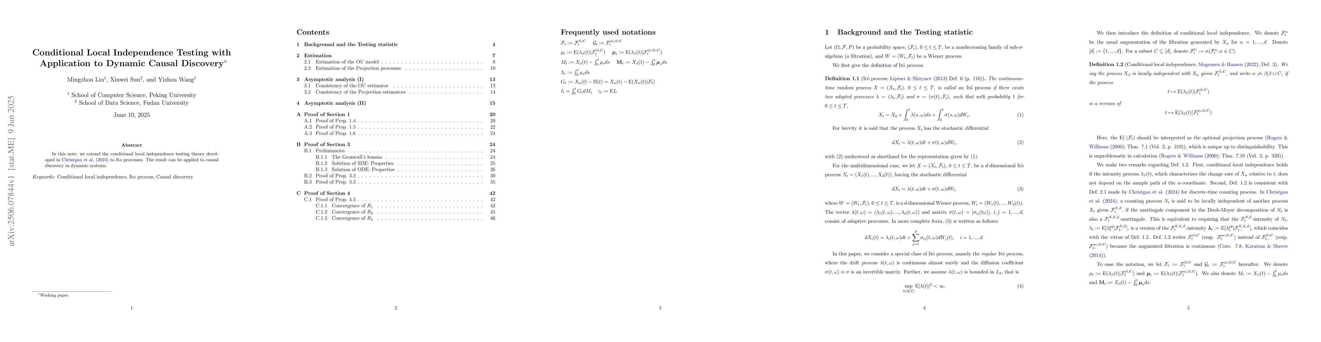 In this note, we extend the conditional local independence testing theory developed in Christgau et al. (2024) to Ito processes. The result can be applied to causal discovery in dynamic systems.