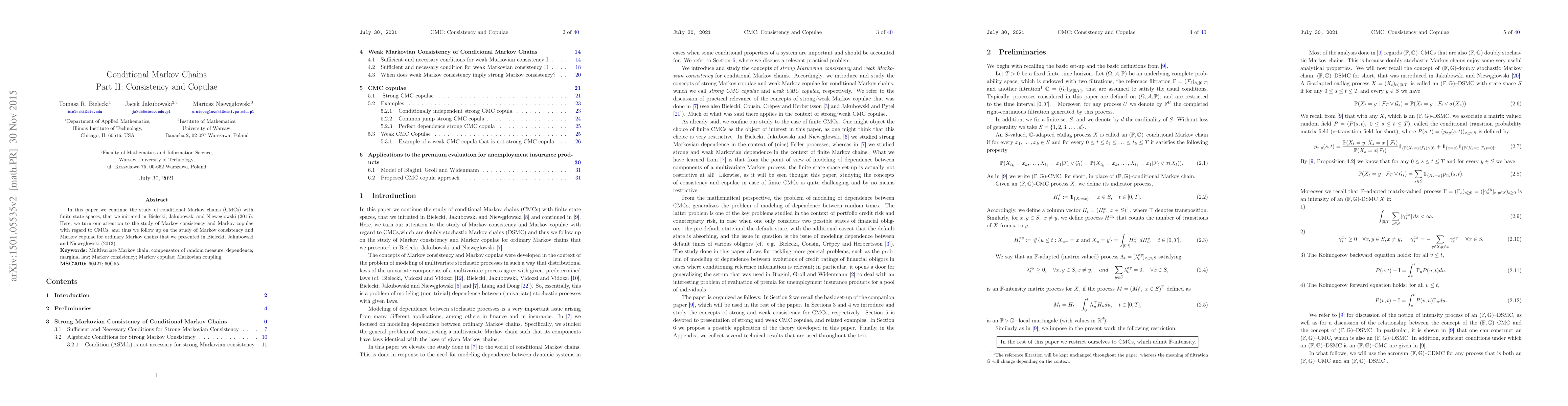 This paper extends the study of conditional Markov chains (CMCs) by exploring Markov consistency and copulae, building on the foundational work in Bielecki, Jakubowski, and Niewęgłowski (2015) and following up on earlier research on ordinary Markov chains (2013). The focus is on the theoretical properties and applications of CMCs in probabilistic modeling.