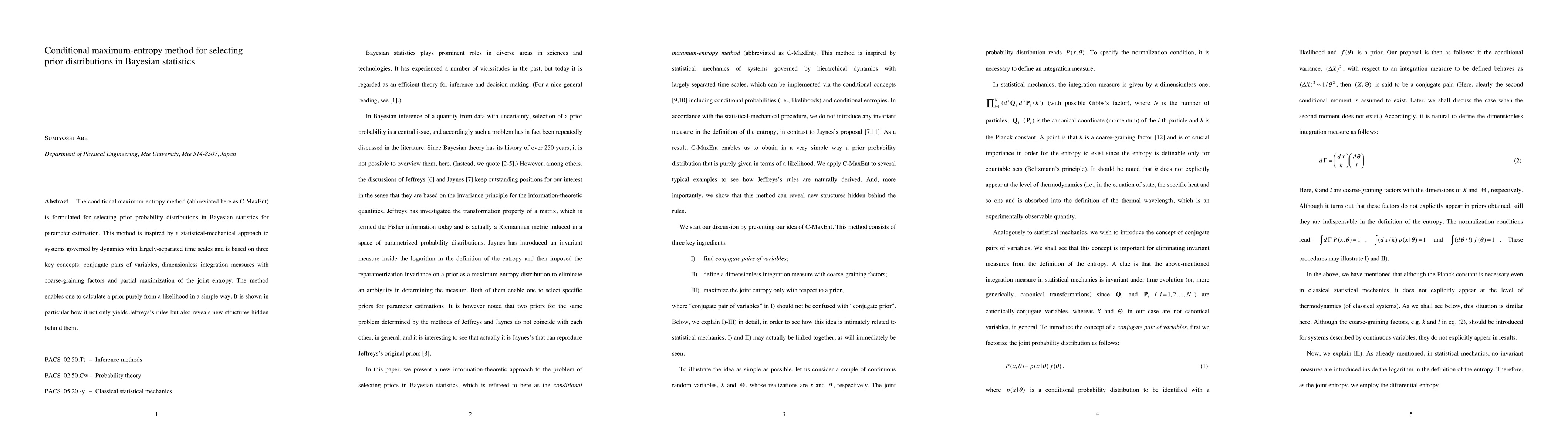 The research introduces the Conditional Maximum-Entropy (C-MaxEnt) method for selecting prior distributions in Bayesian statistics, inspired by statistical mechanics of systems with largely-separated time scales. It emphasizes conjugate pairs of variables, dimensionless integration measures with coarse-graining factors, and partial maximization of joint entropy.