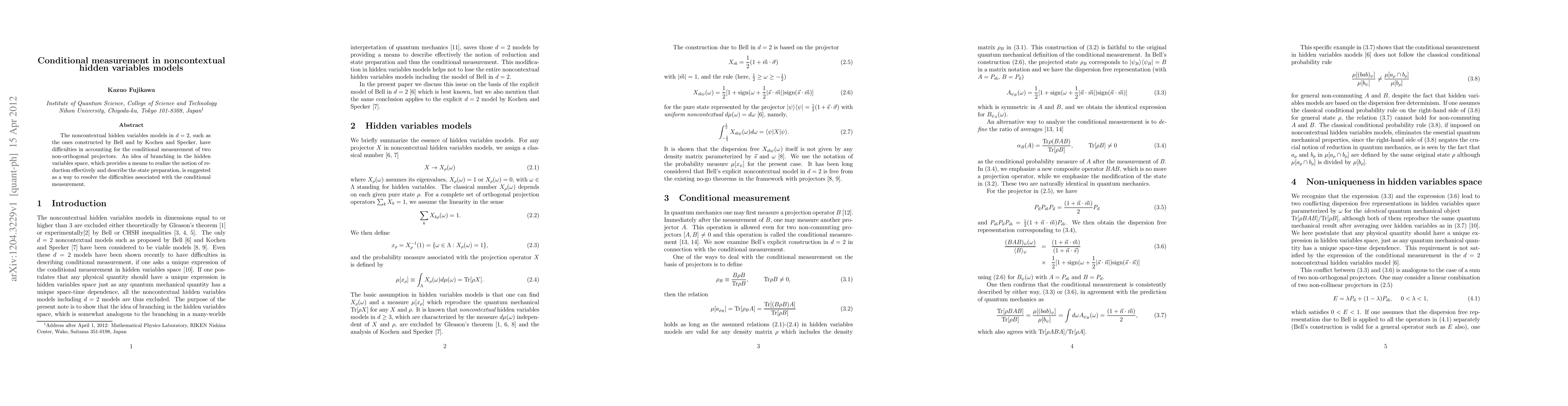 This paper addresses the challenges in noncontextual hidden variable models in two dimensions for conditional measurement of non-orthogonal projectors. It proposes a branching concept in the hidden variable space to effectively implement state preparation and resolve measurement issues.