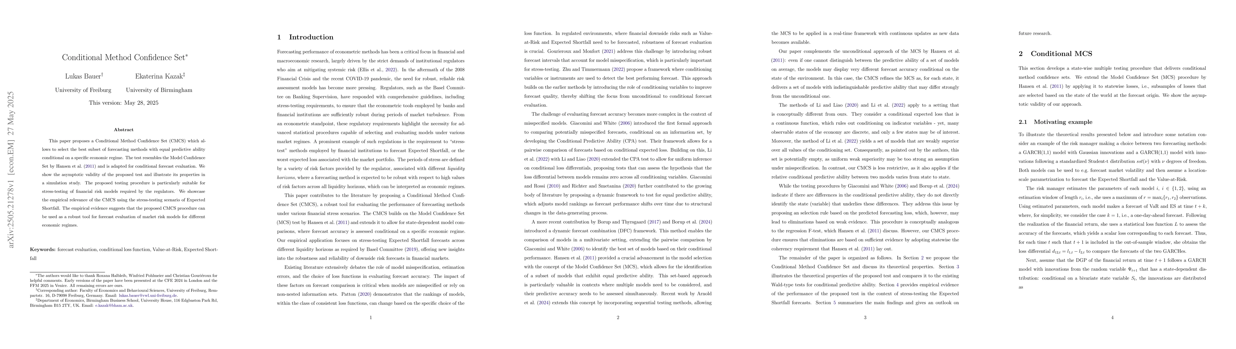 The paper proposes a Conditional Method Confidence Set (CMCS) for selecting the best subset of forecasting methods with equal predictive ability conditional on a specific economic regime, adapting Hansen et al.'s (2011) Model Confidence Set for conditional forecast evaluation.