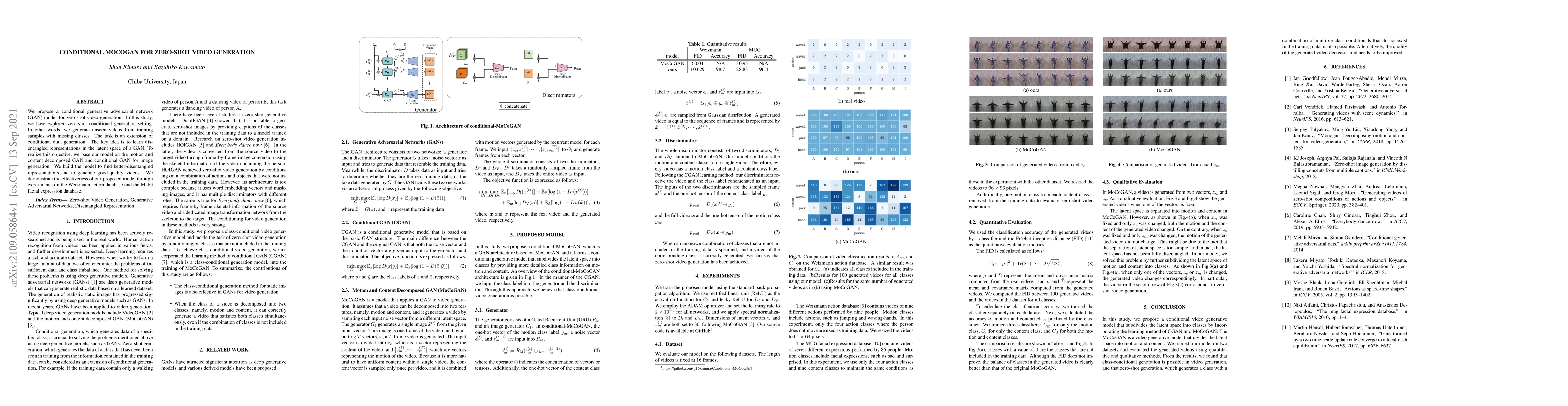 This paper proposes a conditional GAN model for zero-shot video generation, utilizing disentangled representations to generate unseen videos without training samples for those classes. Experiments on the Weizmann and MUG databases show the effectiveness of the model in producing high-quality video outputs.