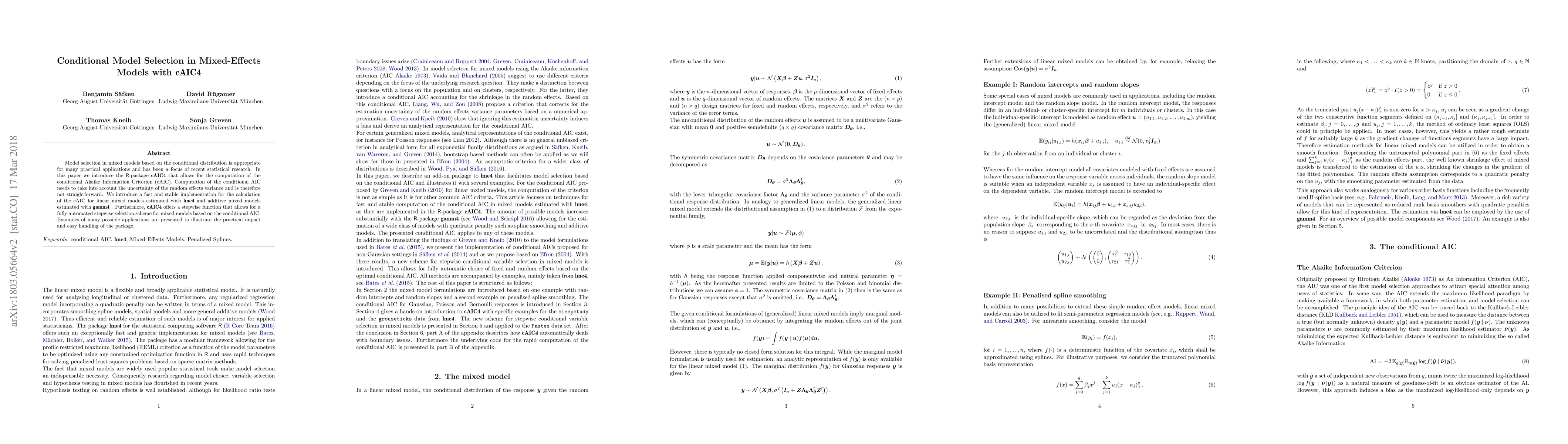 Model selection in mixed models based on the conditional distribution is appropriate for many practical applications and has been a focus of recent statistical research. In this paper we introduce the R-package cAIC4 that allows for the computation of the conditional Akaike Information Criterion (cAIC). Computation of the conditional AIC needs to take into account the uncertainty of the random effects variance and is therefore not straightforward. We introduce a fast and stable implementation for the calculation of the cAIC for linear mixed models estimated with lme4 and additive mixed models estimated with gamm4 . Furthermore, cAIC4 offers a stepwise function that allows for a fully automated stepwise selection scheme for mixed models based on the conditional AIC. Examples of many possible applications are presented to illustrate the practical impact and easy handling of the package.