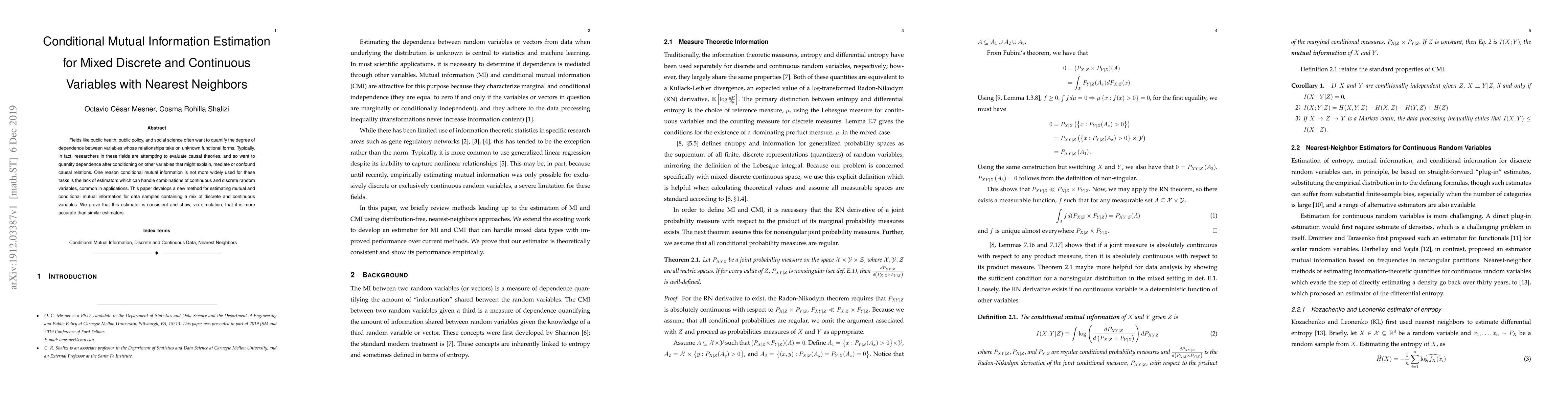 The development of novel estimators for conditional mutual information and feature selection using nearest neighbor methods.