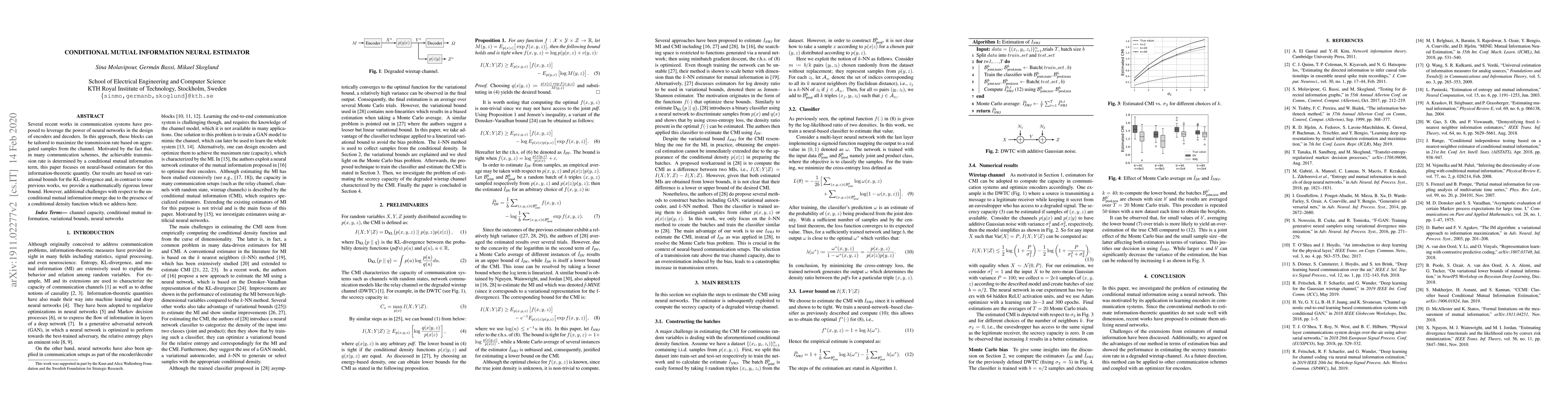 This paper proposes a neural network-based estimator to maximize transmission rate in communication systems by focusing on conditional mutual information. It provides a mathematically rigorous lower bound for the KL-divergence, addressing challenges related to conditional density functions.