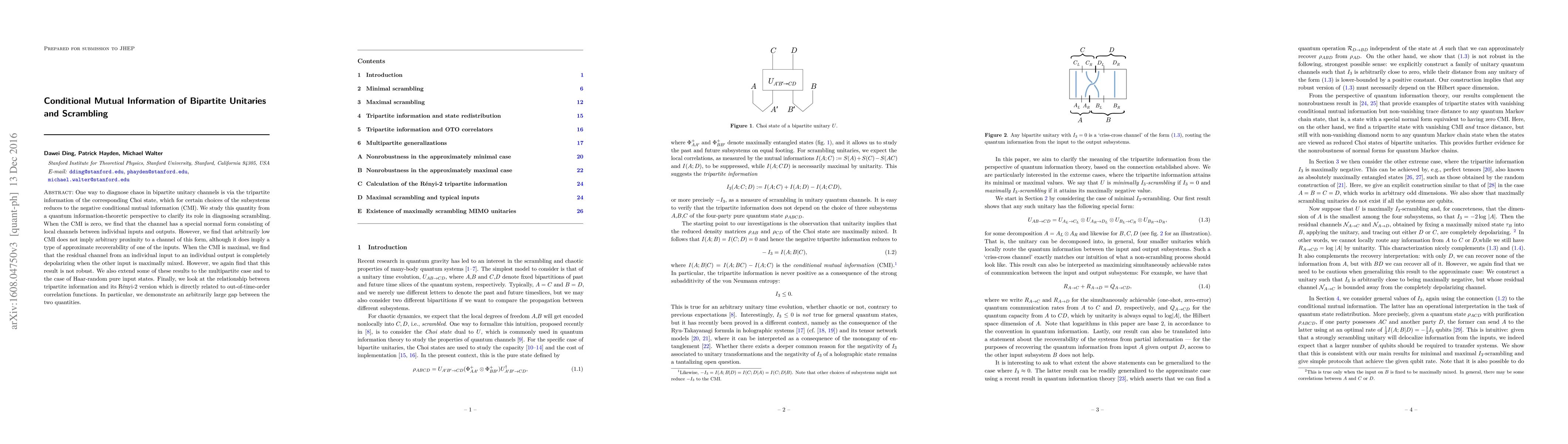 One way to diagnose chaos in bipartite unitary channels is via the tripartite information of the corresponding Choi state, which for certain choices of the subsystems reduces to the negative conditional mutual information (CMI). We study this quantity from a quantum information-theoretic perspective to clarify its role in diagnosing scrambling. When the CMI is zero, we find that the channel has a special normal form consisting of local channels between individual inputs and outputs. However, we find that arbitrarily low CMI does not imply arbitrary proximity to a channel of this form, although it does imply a type of approximate recoverability of one of the inputs. When the CMI is maximal, we find that the residual channel from an individual input to an individual output is completely depolarizing when the other input is maximally mixed. However, we again find that this result is not robust. We also extend some of these results to the multipartite case and to the case of Haar-random pure input states. Finally, we look at the relationship between tripartite information and its Renyi-2 version which is directly related to out-of-time-order correlation functions. In particular, we demonstrate an arbitrarily large gap between the two quantities.