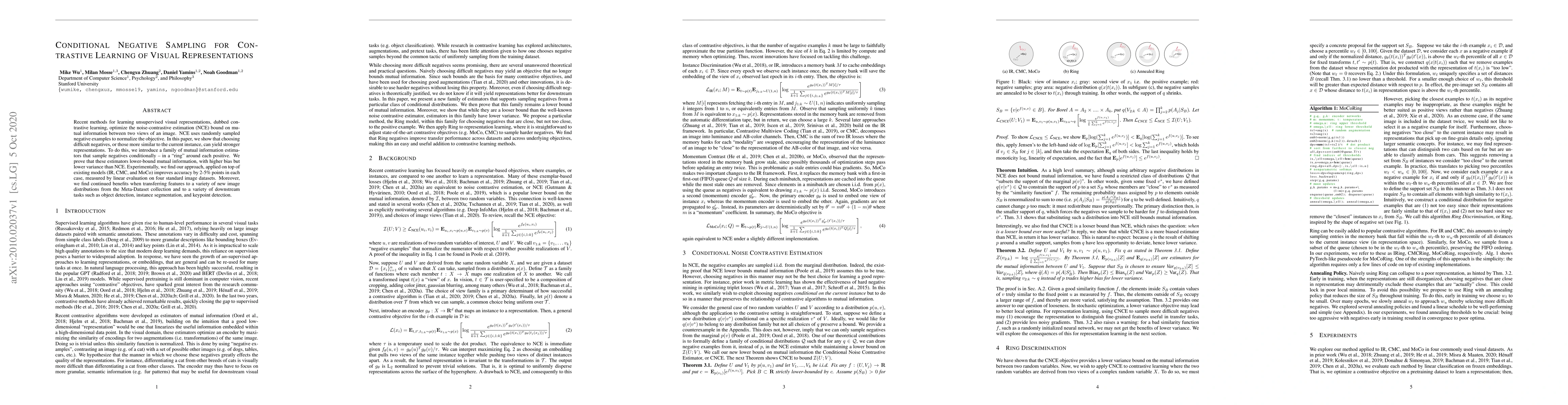 This paper proposes conditional negative sampling for contrastive learning to improve visual representation learning. It introduces a method that selects difficult negatives, which are more similar to the positive instance, leading to stronger representations. The approach improves accuracy by 2-5% on standard image datasets and shows benefits in transferring to new image distributions and tasks.