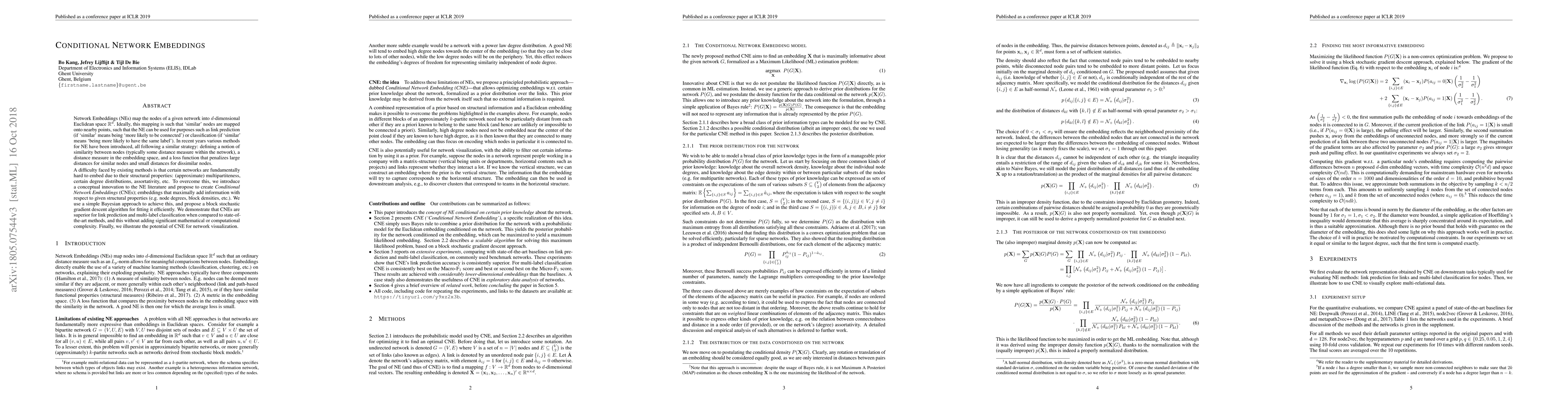 This paper introduces Conditional Network Embeddings (CNEs) to address the challenges of embedding networks with complex structural properties. CNEs leverage a Bayesian approach to maximize information with respect to structural features, outperforming existing methods in link prediction and classification tasks with minimal added complexity.