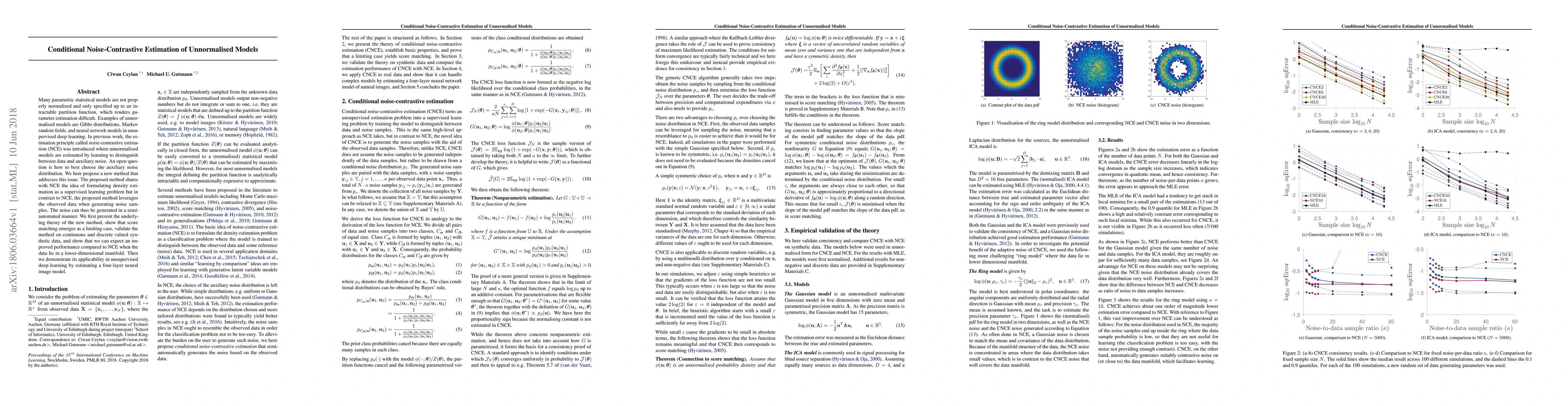 This paper proposes a new conditional noise-contrastive estimation method for unnormalised models, improving upon traditional NCE by generating auxiliary noise based on observed data. The method shows improved performance, especially for data in lower-dimensional manifolds, and is validated on synthetic data and applied to a four-layer neural image model.
