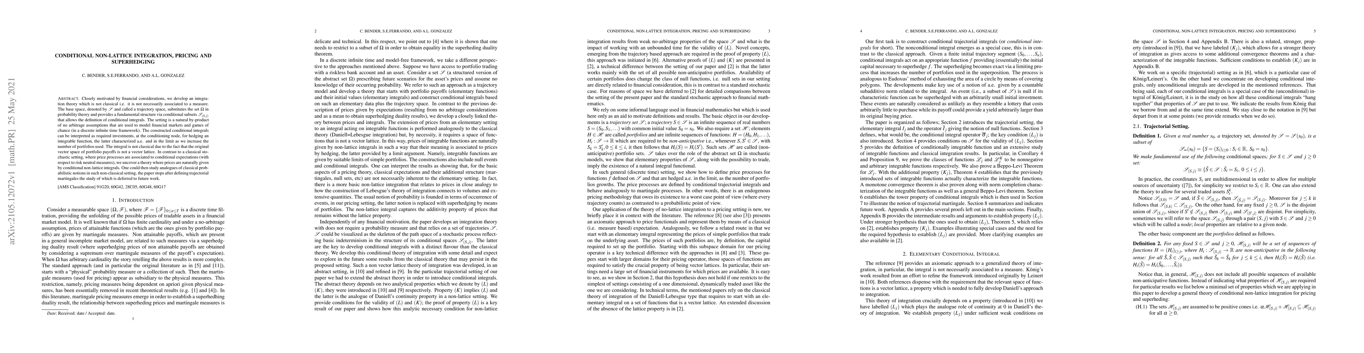 Researchers developed a new integration theory for financial modeling that allows for non-classical pricing and superhedging of investments. This theory is based on conditional subsets and provides a framework for understanding prices in terms of conditional non-lattice integrals.