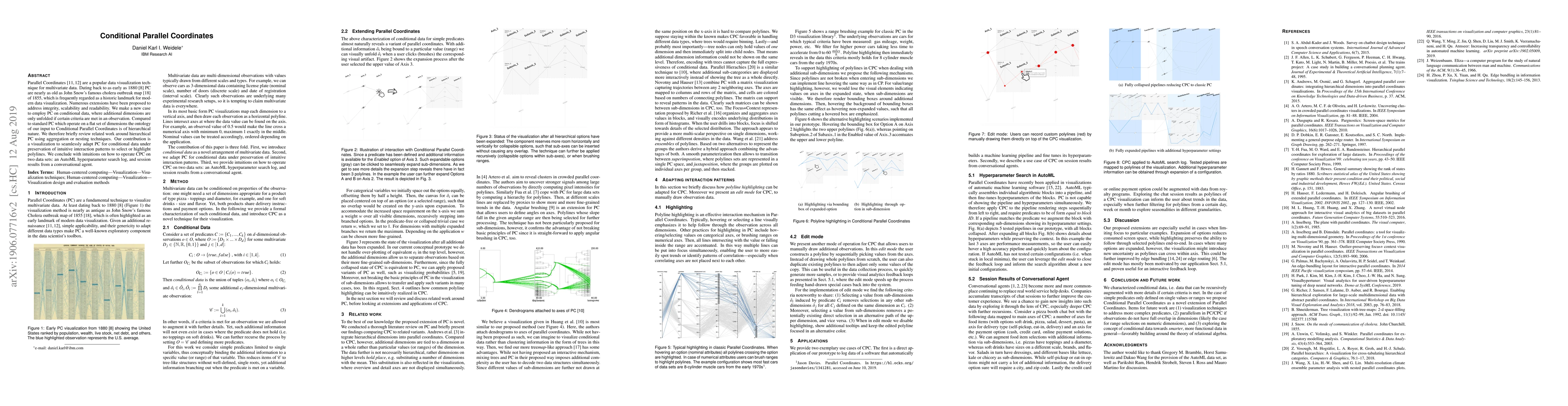 Conditional Parallel Coordinates adapt traditional Parallel Coordinates for visualizing multivariate data where additional dimensions are revealed based on specific criteria. This approach maintains intuitive interaction patterns while addressing the hierarchical nature of conditional data, demonstrated through applications on an AutoML log and conversational agent session results.