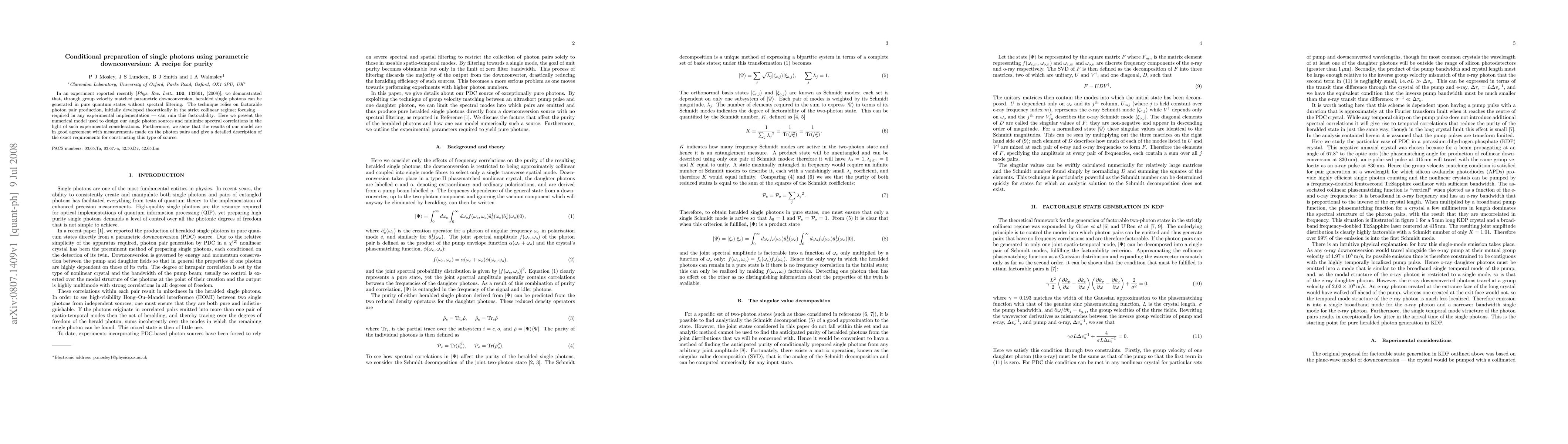 In an experiment reported recently [Phys. Rev. Lett. 100, 133601 (2008)], we demonstrated that, through group velocity matched parametric downconversion, heralded single photons can be generated in pure quantum states without spectral filtering. The technique relies on factorable photon pair production, initially developed theoretically in the strict collinear regime; focusing - required in any experimental implementation - can ruin this factorability. Here we present the numerical model used to design our single photon sources and minimize spectral correlations in the light of such experimental considerations. Furthermore, we show that the results of our model are in good agreement with measurements made on the photon pairs and give a detailed description of the exact requirements for constructing this type of source.