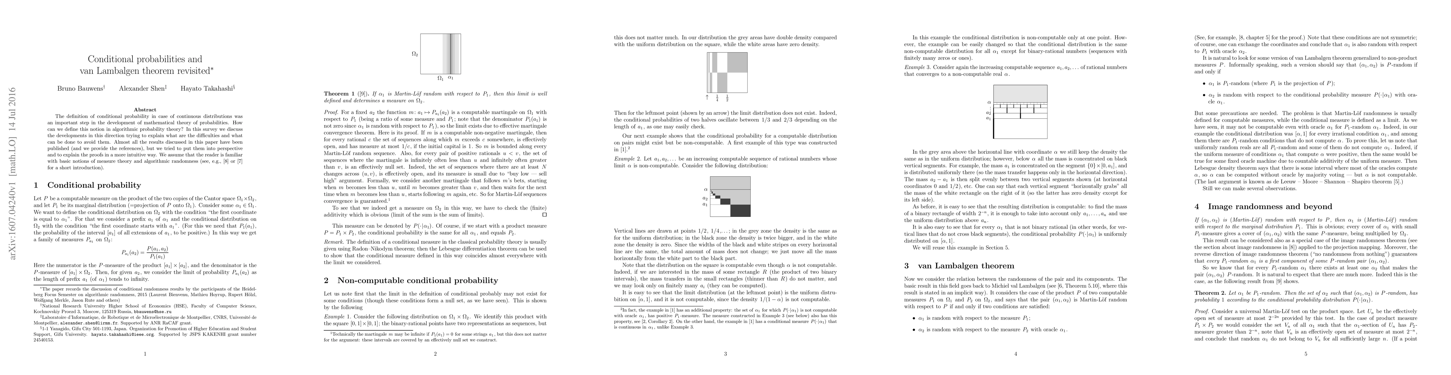The definition of conditional probability in case of continuous distributions was an important step in the development of mathematical theory of probabilities. How can we define this notion in algorithmic probability theory? In this survey we discuss the developments in this direction trying to explain what are the difficulties and what can be done to avoid them. Almost all the results discussed in this paper have been published (and we provide the references), but we tried to put them into perspective and to explain the proofs in a more intuitive way. We assume that the reader is familiar with basic notions of measure theory and algorithmic randomness.