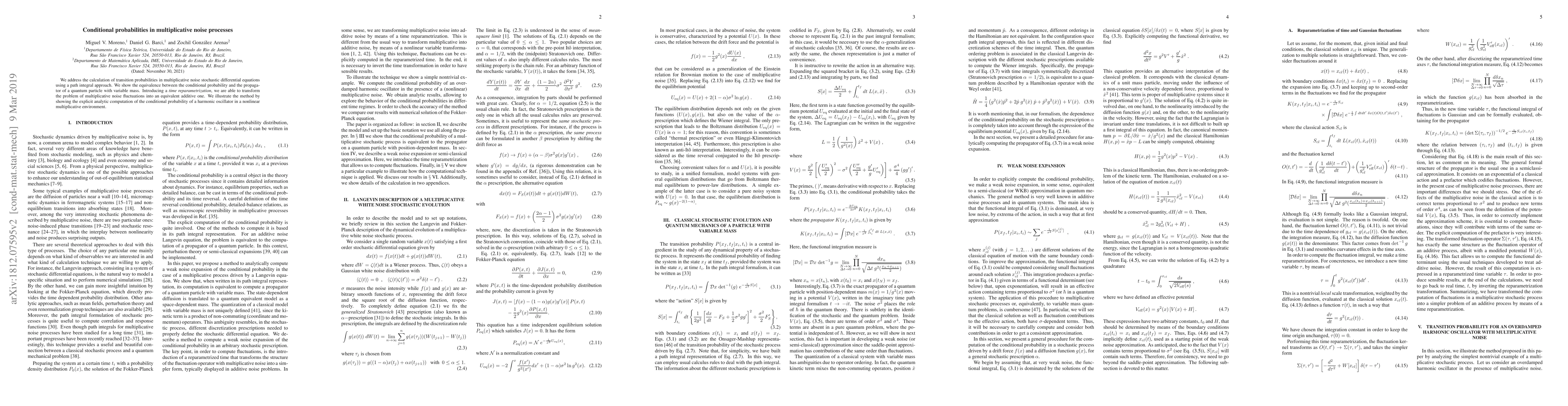 This paper explores the calculation of transition probabilities in multiplicative noise stochastic differential equations via a path integral method, demonstrating an equivalence to the propagator of a quantum particle with variable mass. The method employs a time reparametrization to convert multiplicative noise into an additive one, illustrated through an explicit analytic computation of a harmonic oscillator in a nonlinear multiplicative environment.