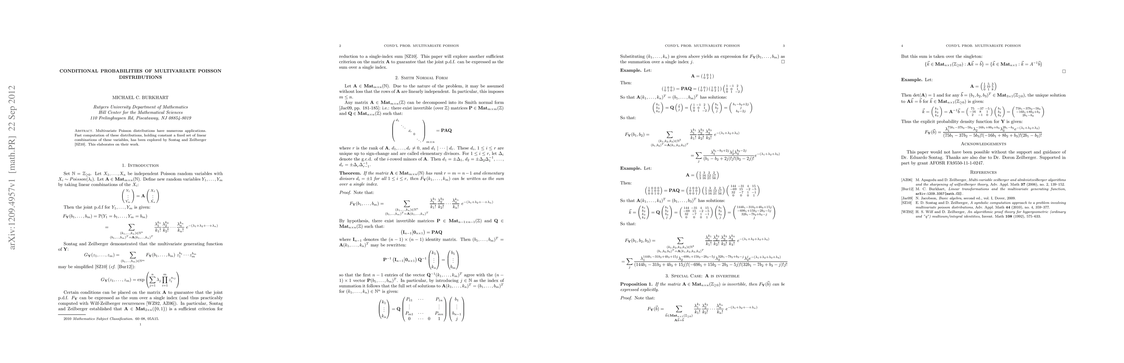 Multivariate Poisson distributions have numerous applications. Fast computation of these distributions, holding constant a fixed set of linear combinations of these variables, has been explored by Sontag and Zeilberger. This elaborates on their work.
