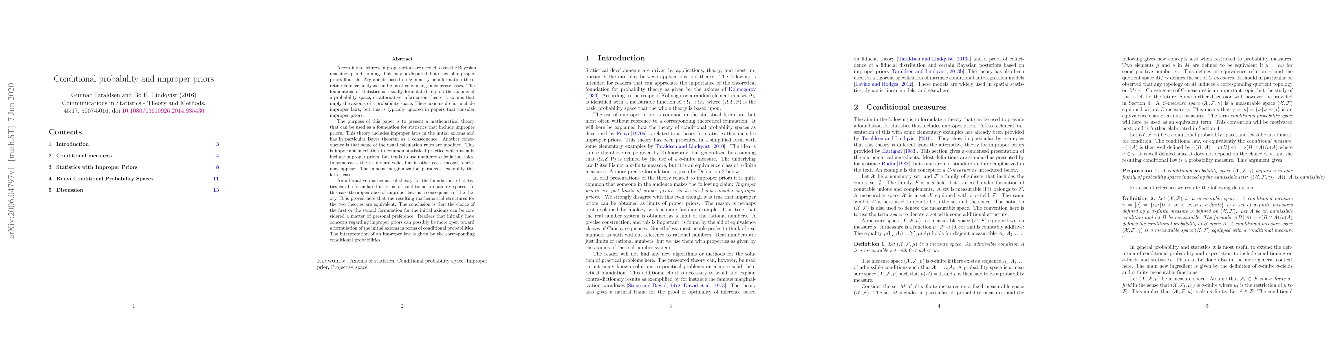 The purpose of this paper is to present a mathematical theory that can be used as a foundation for statistics that include improper priors. This theory includes improper laws in the initial axioms and has in particular Bayes theorem as a consequence. Another consequence is that some of the usual calculation rules are modified. This is important in relation to common statistical practice which usually include improper priors, but tends to use unaltered calculation rules. In some cases the results are valid, but in other cases inconsistencies may appear. The famous marginalization paradoxes exemplify this latter case. An alternative mathematical theory for the foundations of statistics can be formulated in terms of conditional probability spaces. In this case the appearance of improper laws is a consequence of the theory. It is proved here that the resulting mathematical structures for the two theories are equivalent. The conclusion is that the choice of the first or the second formulation for the initial axioms can be considered a matter of personal preference. Readers that initially have concerns regarding improper priors can possibly be more open toward a formulation of the initial axioms in terms of conditional probabilities. The interpretation of an improper law is given by the corresponding conditional probabilities. Keywords: Axioms of statistics, Conditional probability space, Improper prior, Projective space
