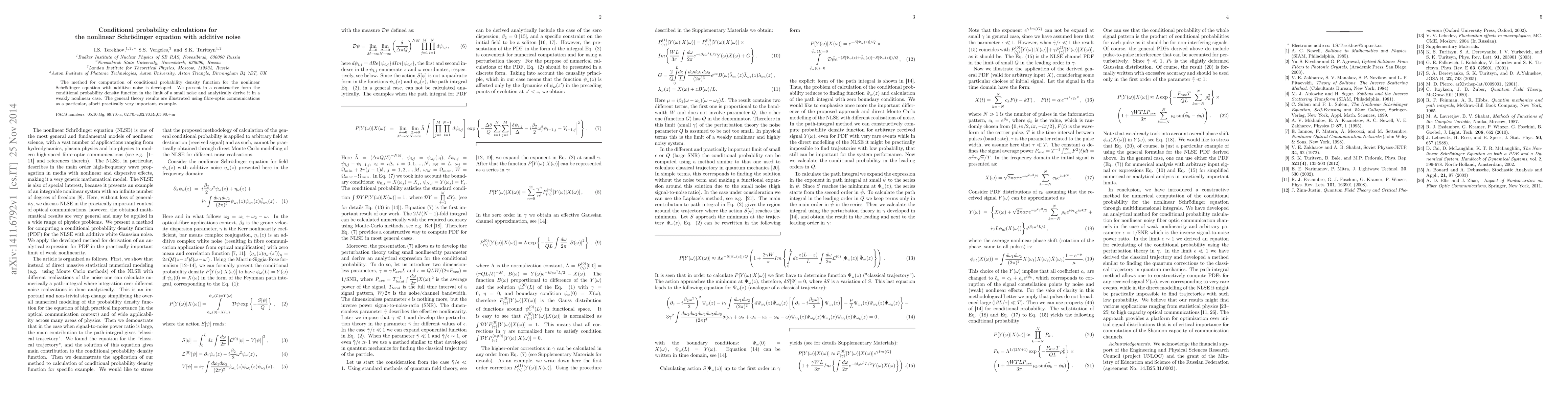 This paper develops a method for computing the conditional probability density function for the nonlinear Schrödinger equation with additive noise, presenting constructive forms and analytical derivations in small noise and weakly nonlinear cases. The theory is exemplified through its application to fibre-optic communications.