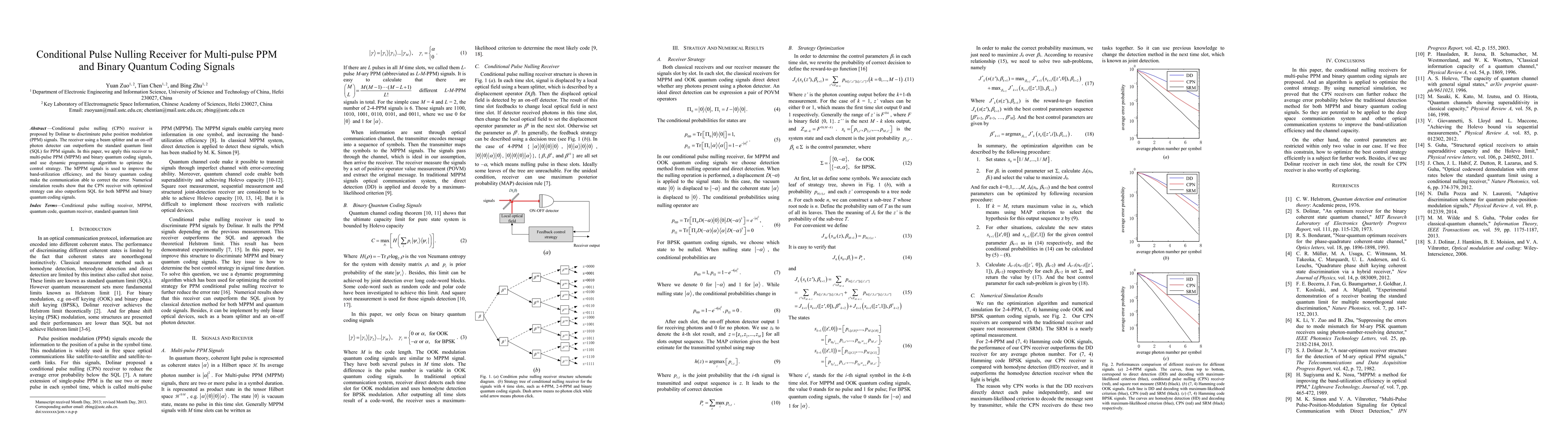 This paper proposes a conditional pulse nulling (CPN) receiver to enhance discrimination of multi-pulse PPM and binary quantum coding signals, achieving performance beyond the standard quantum limit (SQL). The optimized control strategy using dynamic programming improves band-utilization efficiency and error correction capabilities.