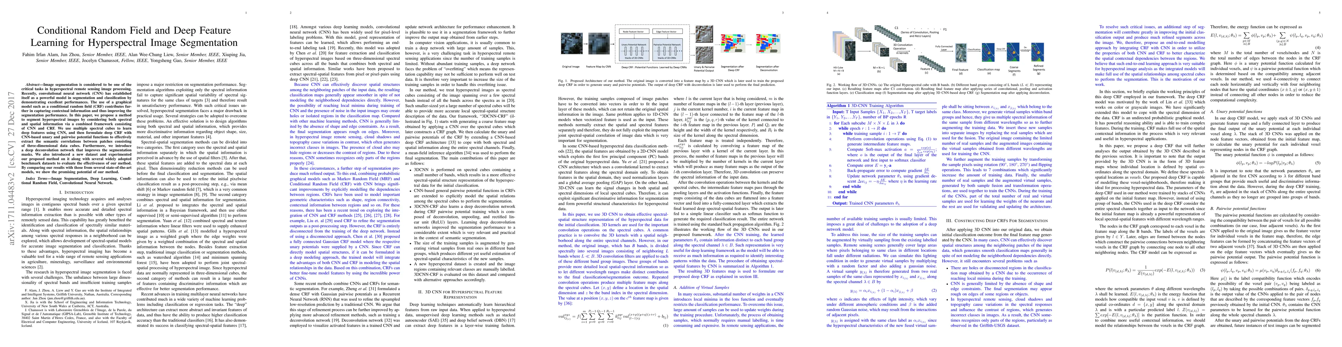 This paper proposes a hybrid framework combining CNN and CRF for hyperspectral image segmentation, leveraging deep feature learning and contextual information to enhance segmentation performance. The method uses a deep deconvolution network to refine segmentation masks and introduces a new dataset for evaluation.