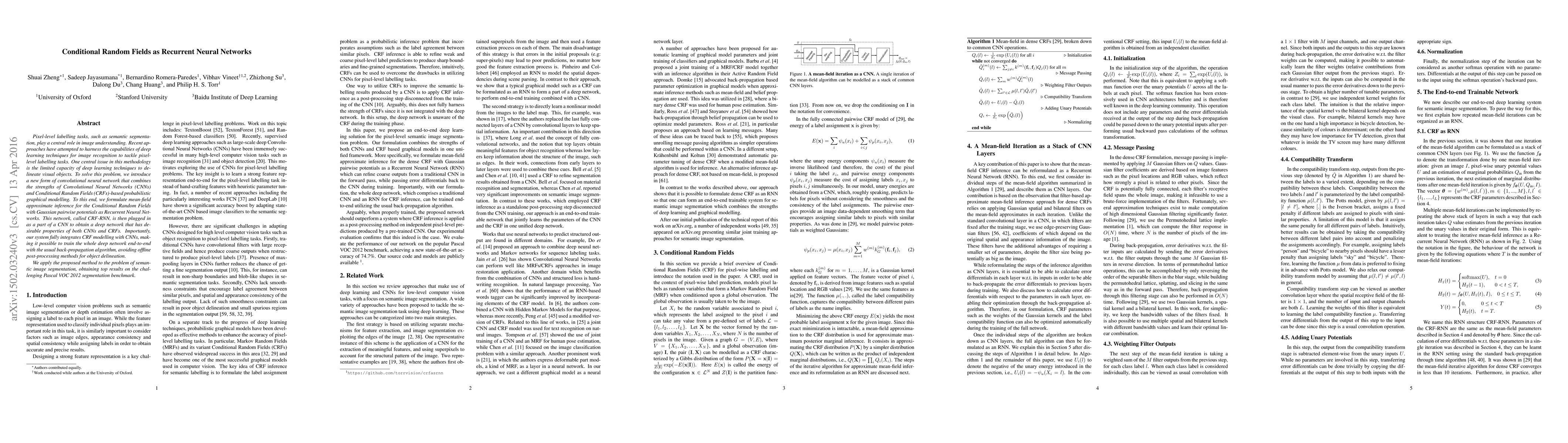 This paper proposes a novel convolutional neural network that integrates Conditional Random Fields (CRFs) with Recurrent Neural Networks (RNNs) to enhance pixel-level labelling tasks like semantic segmentation. The CRF-RNN model combines CNNs and CRFs, enabling end-to-end training and achieving state-of-the-art results on the Pascal VOC 2012 segmentation benchmark.