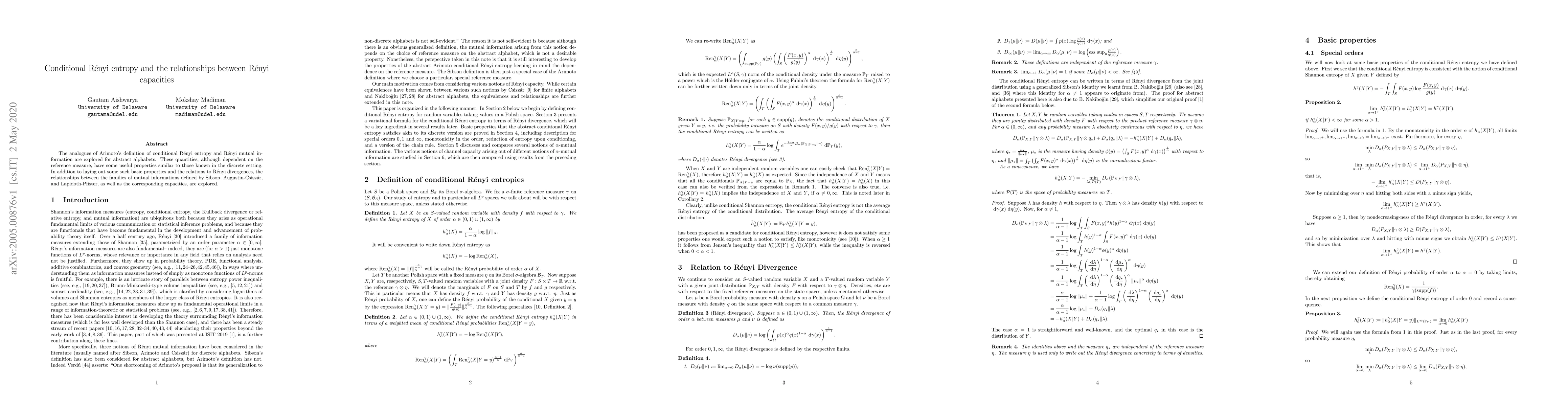 This paper explores the definitions and properties of conditional Rényi entropy and mutual information for abstract alphabets, highlighting their similarities to discrete settings. It also investigates the relationships between various Rényi capacities, including those defined by Sibson, Augustin-Csiszár, and Lapidoth-Pfister.