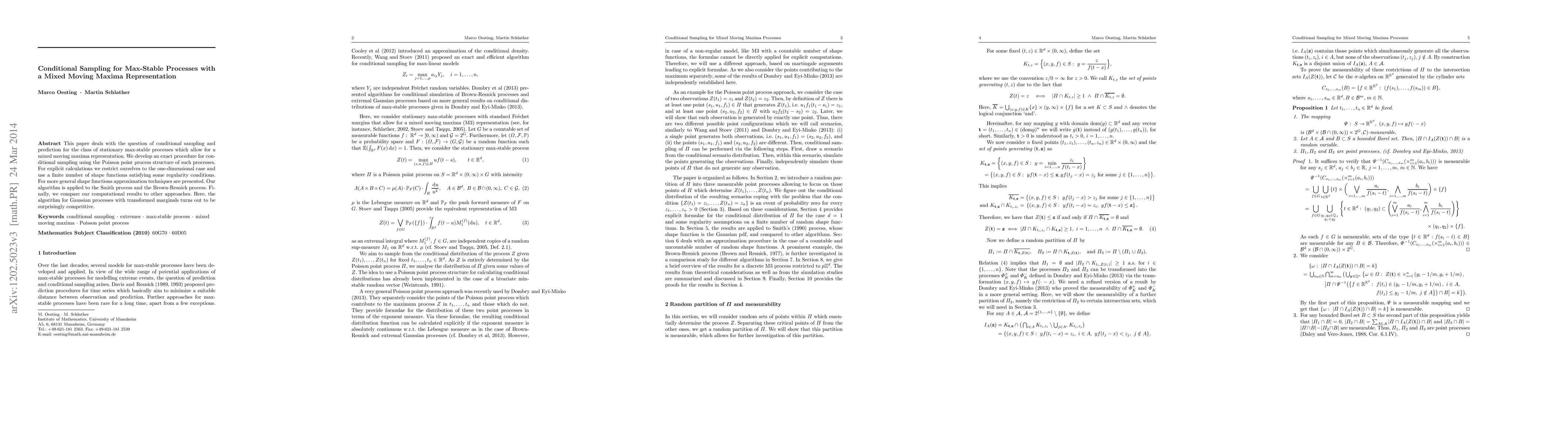 This paper presents an exact procedure for conditional sampling of stationary max-stable processes using a mixed moving maxima representation, focusing on the one-dimensional case with finite shape functions and approximation techniques for more general cases. The developed algorithm is applied to the Smith and Brown-Resnick processes, showing competitive results compared to other methods.
