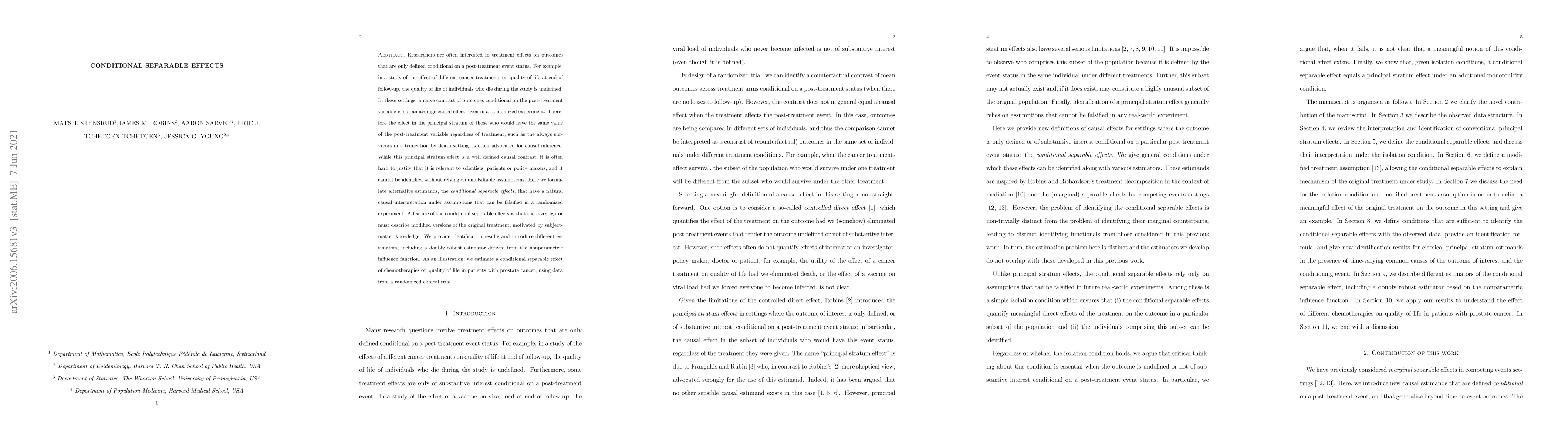 Researchers are often interested in treatment effects on outcomes that are only defined conditional on a post-treatment event status. For example, in a study of the effect of different cancer treatments on quality of life at end of follow-up, the quality of life of individuals who die during the study is undefined. In these settings, a naive contrast of outcomes conditional on the post-treatment variable is not an average causal effect, even in a randomized experiment. Therefore the effect in the principal stratum of those who would have the same value of the post-treatment variable regardless of treatment, such as the always survivors in a truncation by death setting, is often advocated for causal inference. While this principal stratum effect is a well defined causal contrast, it is often hard to justify that it is relevant to scientists, patients or policy makers, and it cannot be identified without relying on unfalsifiable assumptions. Here we formulate alternative estimands, the conditional separable effects, that have a natural causal interpretation under assumptions that can be falsified in a randomized experiment. We provide identification results and introduce different estimators, including a doubly robust estimator derived from the nonparametric influence function. As an illustration, we estimate a conditional separable effect of chemotherapies on quality of life in patients with prostate cancer, using data from a randomized clinical trial.