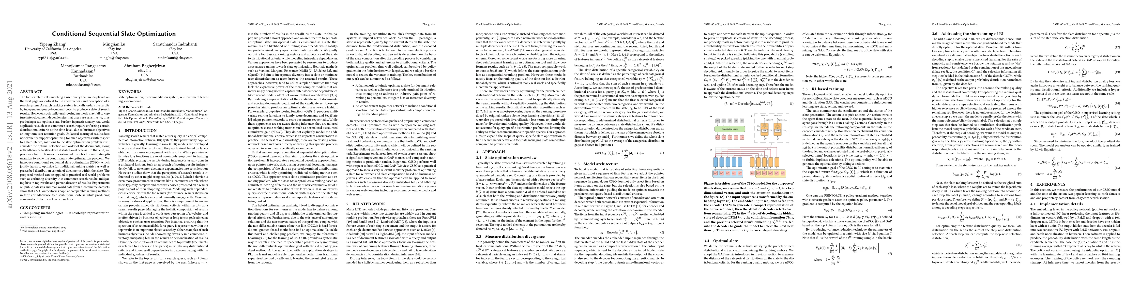 The paper proposes a conditional sequential slate optimization (CSSO) framework to optimize search results by considering both traditional ranking metrics and distributional criteria, addressing inter-document dependencies and real-world application needs like diversity and bias mitigation in e-commerce search. Experiments demonstrate CSSO's superior performance in adhering to distributional criteria while maintaining relevance.