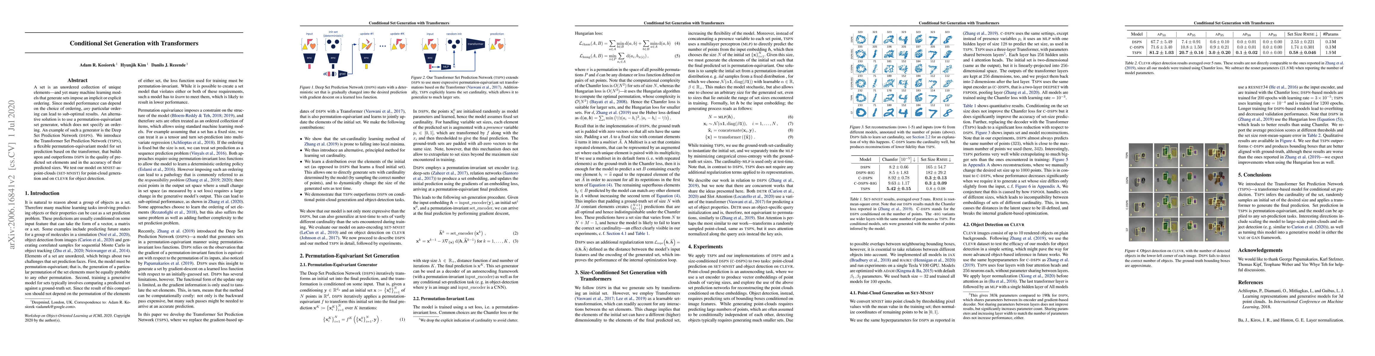 The Transformer Set Prediction Network (TSPN) is a permutation-equivariant model based on transformers that outperforms the DeepSet Prediction Network (DSPN) in generating sets without imposing an order, tested on SET-MNIST and CLEVR datasets. TSPN achieves higher accuracy in predicted set elements and sizes.