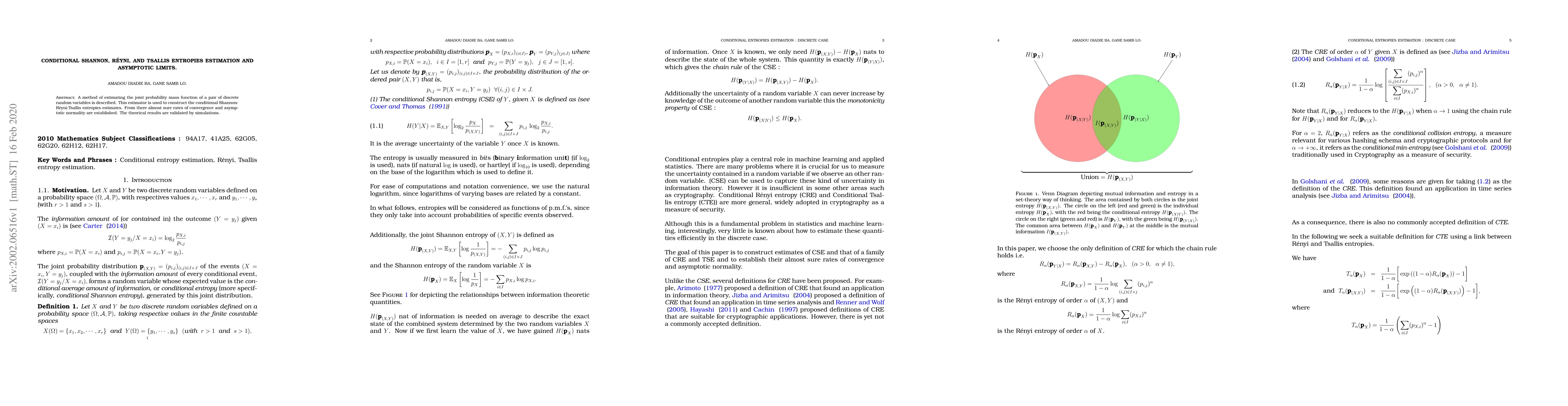 This paper proposes an estimator for the joint probability mass function of two discrete random variables, and uses it to derive estimates for conditional Shannon, Rényi, and Tsallis entropies. Theoretical results on convergence and asymptotic normality are validated through simulations.